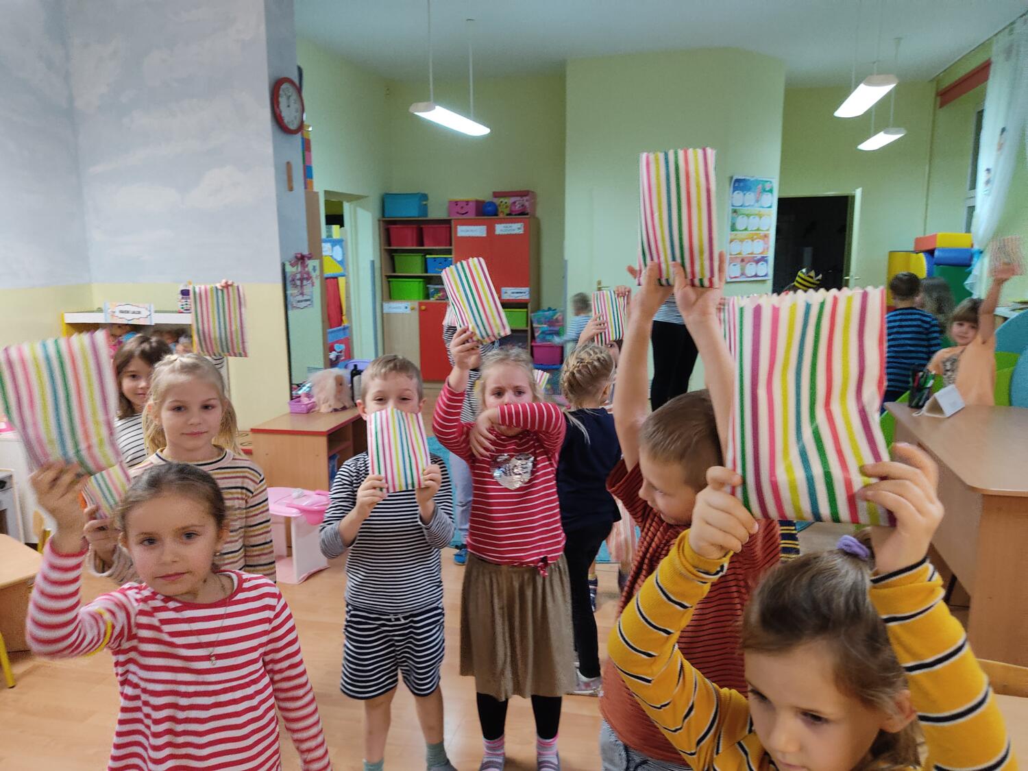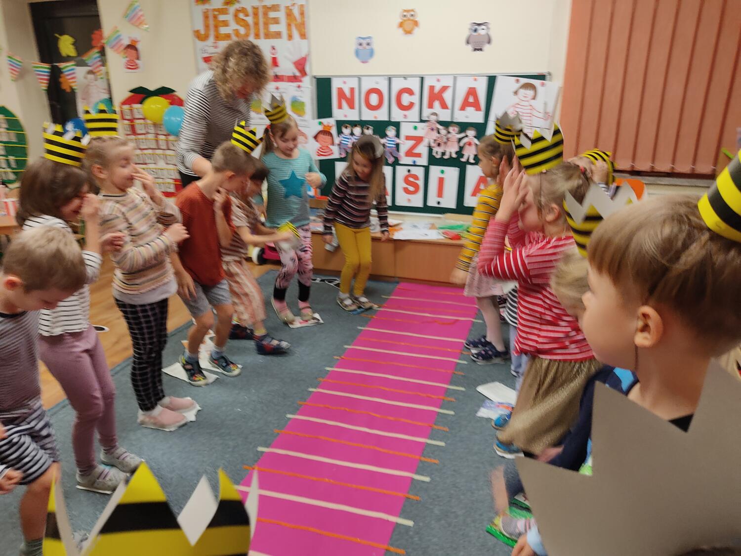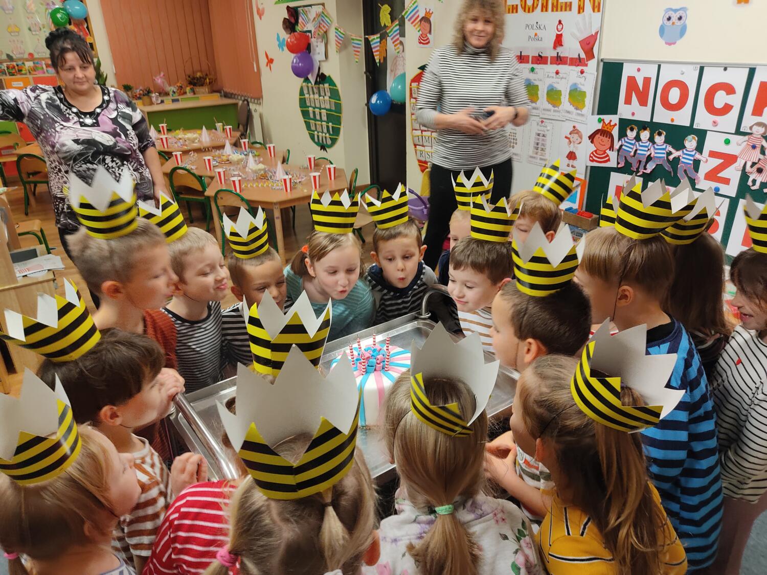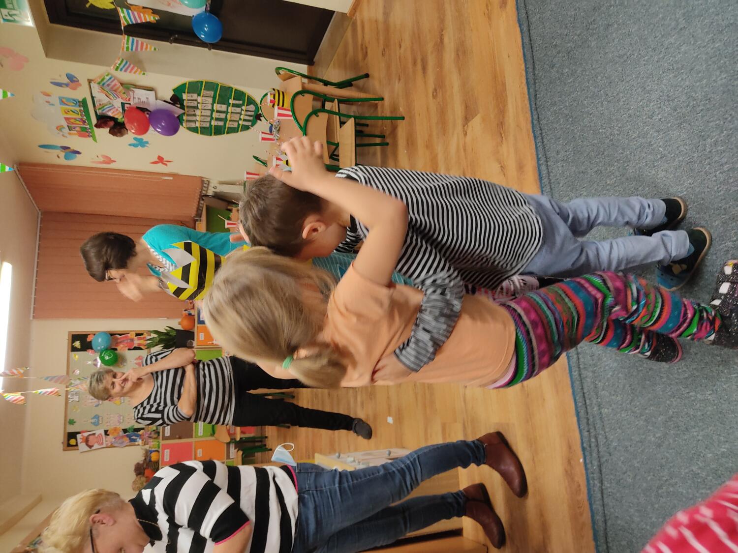 Na nockę czekaliśmy z wielkim napięciem. W ten piątkowy wieczór i noc tj. 19.11/20.11.21r spotkanie z Basią się dokonało. Pamiętaliśmy wszyscy by towarzyszyć Basi przyozdobieni w jej ulubione paski, nikt nie zapomniał zabrać z domu paskowych kreacji- zresztą nie skończyło się tylko na paskowej garderobie, czegóż nie było w paski- śpiwory, serwetki, kubeczki, paskowy wybieg i przede wszystkim paskowy tort Basi. Zanim jednak było tradycyjne 100lat dla naszej literackiej solenizantki, to wcześniej każdy z wielką odwagą w sercu przeszedł po wybiegu witając się z Basią, bawiliśmy się w kreatorów paskowej mody- tworząc niepowtarzalne kreacje , dmuchaliśmy kuleczki by udekorować strój Janka i Basi, a jeszcze i potem był wielki konkurs „Jaka jest Basia”- wszyscy okazali się znawcami Basi- dlatego też każdy otrzymał koronę i upominki od Basi w postaci neonowej biżuterii, fascynującej torby na żelki, a i same żelki odszukaliśmy w plenerach przedszkolnych sal po mega ekscytujących zawodach sportowych . Nocny pokaz i zarazem premiera filmu z Basią i czytanie fragmentu książki okazały się ostatnim punktem zabaw. Udaliśmy się do naszej przedszkolnej sypialni i hop do cieplutkich śpiworków. Tak od razu nie zasnęliśmy- były pogaduchy do poduchy i mocne postanowienie – że tej nocy nikt nie zaśnie. To było tak około drugiej nad ranem,…jednak Orfeusz zadbał o nas i zaczarował nas snem. Jakież było nasze zdziwienie rankiem , gdy zerkaliśmy na siebie i zobaczyliśmy pasiaste paseczki na naszych buziach. Mega zadowoleni budziliśmy się , cieszyliśmy się tym , co przeżyliśmy nocą. Ciepłe śniadanko i już tylko czekanie na rodziców uzmysłowiło nam ,że ta przygoda definitywnie dobiegła końca. Dziękujemy Basi za tak cudowną nockę i na pewno o Basi nigdy nie zapomnimy.