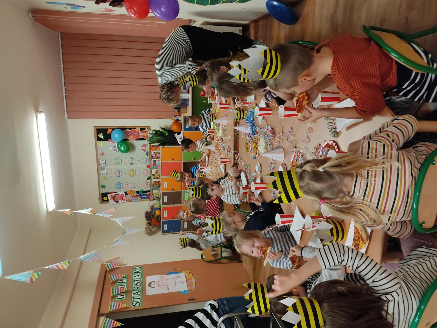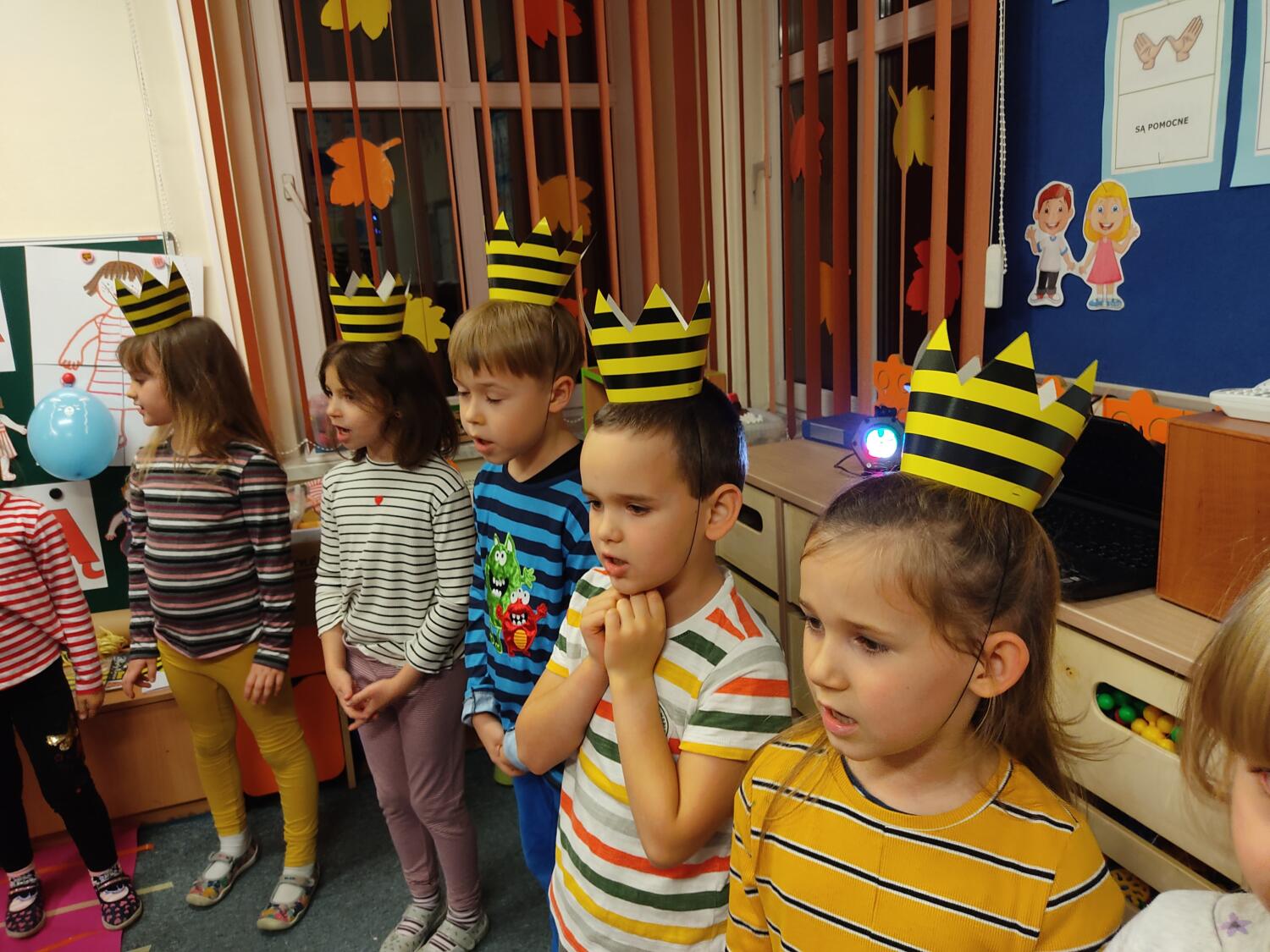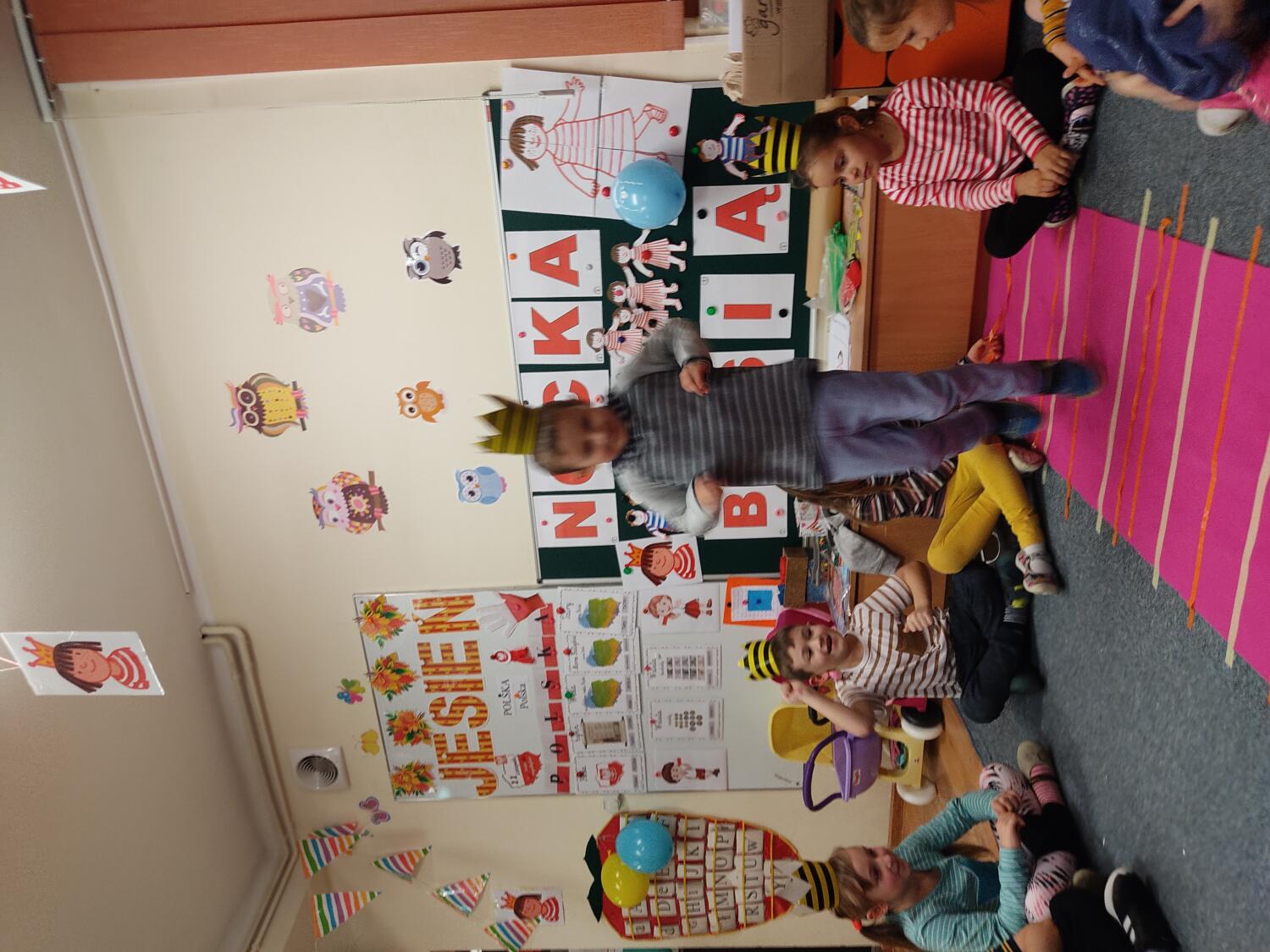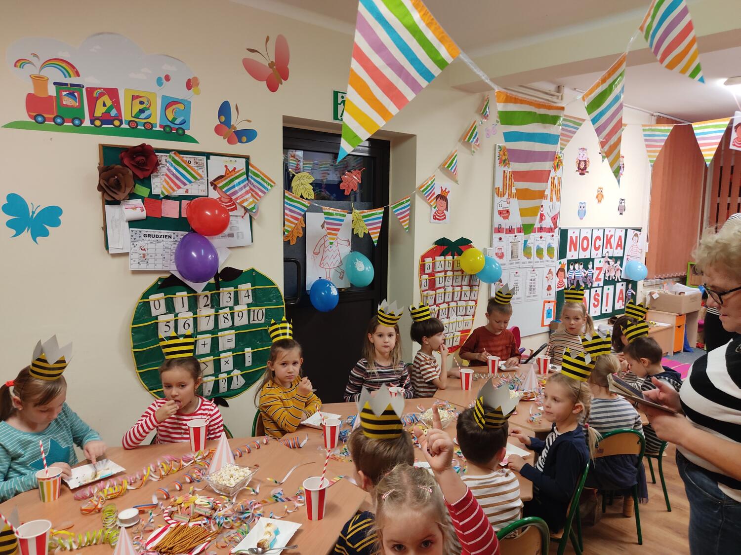 Na nockę czekaliśmy z wielkim napięciem. W ten piątkowy wieczór i noc tj. 19.11/20.11.21r spotkanie z Basią się dokonało. Pamiętaliśmy wszyscy by towarzyszyć Basi przyozdobieni w jej ulubione paski, nikt nie zapomniał zabrać z domu paskowych kreacji- zresztą nie skończyło się tylko na paskowej garderobie, czegóż nie było w paski- śpiwory, serwetki, kubeczki, paskowy wybieg i przede wszystkim paskowy tort Basi. Zanim jednak było tradycyjne 100lat dla naszej literackiej solenizantki, to wcześniej każdy z wielką odwagą w sercu przeszedł po wybiegu witając się z Basią, bawiliśmy się w kreatorów paskowej mody- tworząc niepowtarzalne kreacje , dmuchaliśmy kuleczki by udekorować strój Janka i Basi, a jeszcze i potem był wielki konkurs „Jaka jest Basia”- wszyscy okazali się znawcami Basi- dlatego też każdy otrzymał koronę i upominki od Basi w postaci neonowej biżuterii, fascynującej torby na żelki, a i same żelki odszukaliśmy w plenerach przedszkolnych sal po mega ekscytujących zawodach sportowych . Nocny pokaz i zarazem premiera filmu z Basią i czytanie fragmentu książki okazały się ostatnim punktem zabaw. Udaliśmy się do naszej przedszkolnej sypialni i hop do cieplutkich śpiworków. Tak od razu nie zasnęliśmy- były pogaduchy do poduchy i mocne postanowienie – że tej nocy nikt nie zaśnie. To było tak około drugiej nad ranem,…jednak Orfeusz zadbał o nas i zaczarował nas snem. Jakież było nasze zdziwienie rankiem , gdy zerkaliśmy na siebie i zobaczyliśmy pasiaste paseczki na naszych buziach. Mega zadowoleni budziliśmy się , cieszyliśmy się tym , co przeżyliśmy nocą. Ciepłe śniadanko i już tylko czekanie na rodziców uzmysłowiło nam ,że ta przygoda definitywnie dobiegła końca. Dziękujemy Basi za tak cudowną nockę i na pewno o Basi nigdy nie zapomnimy.