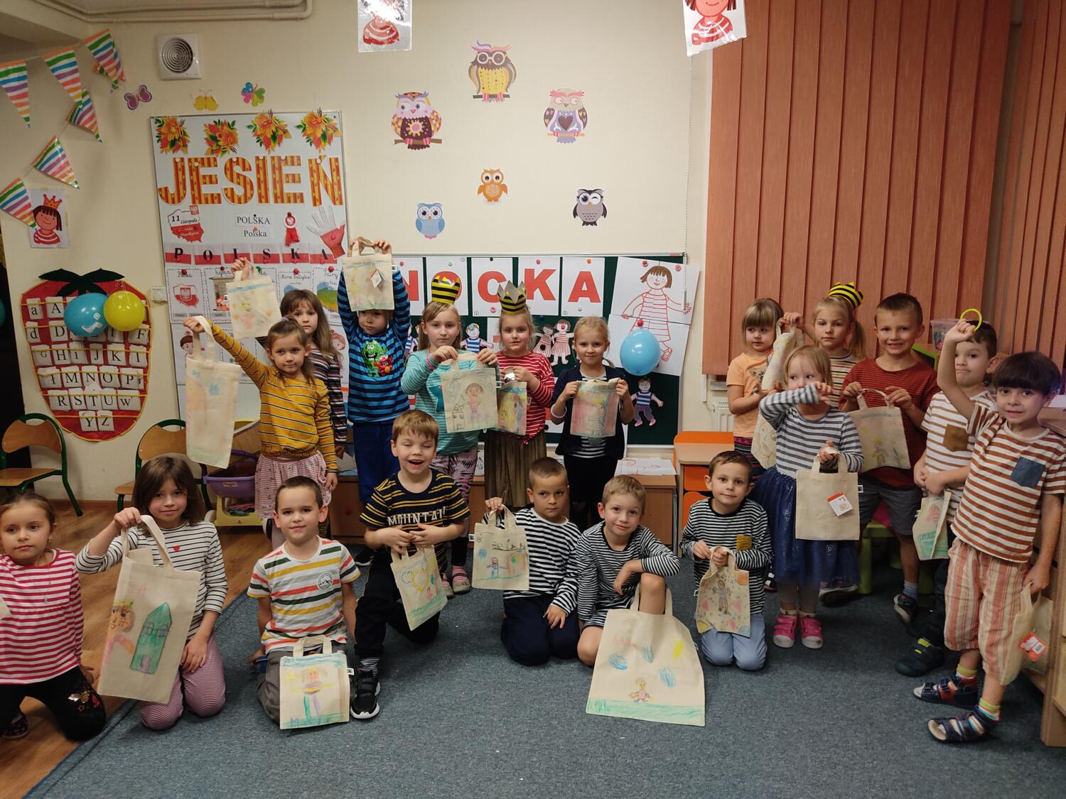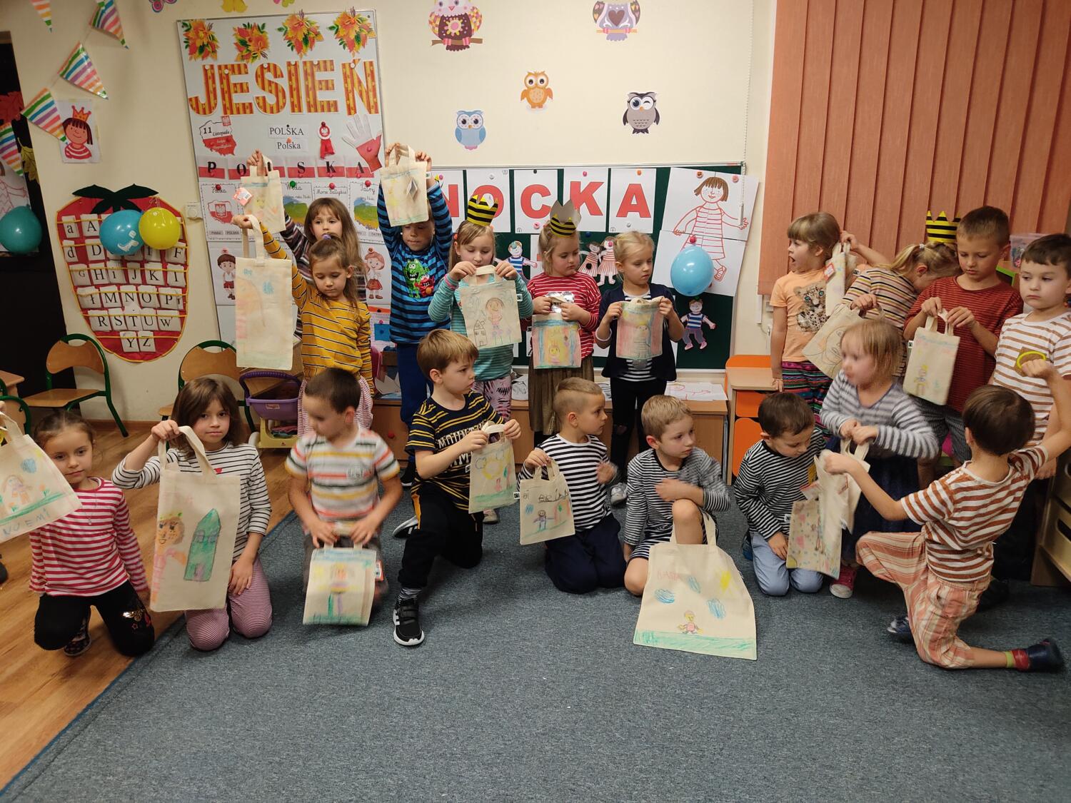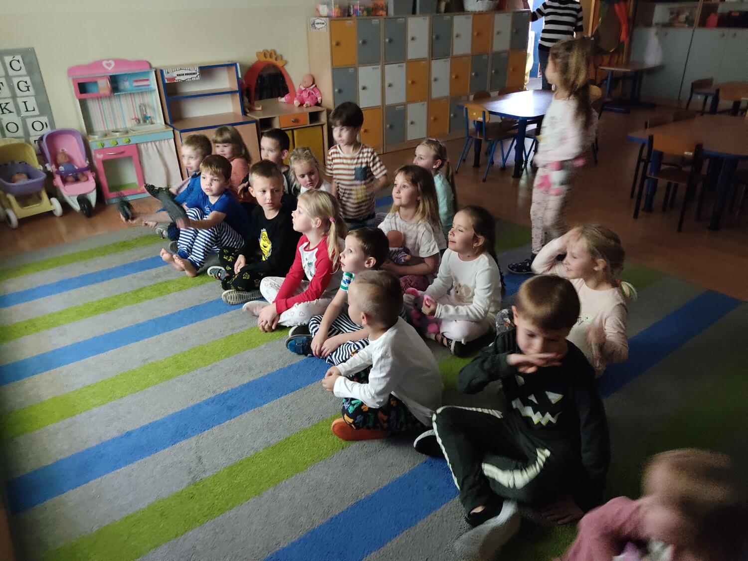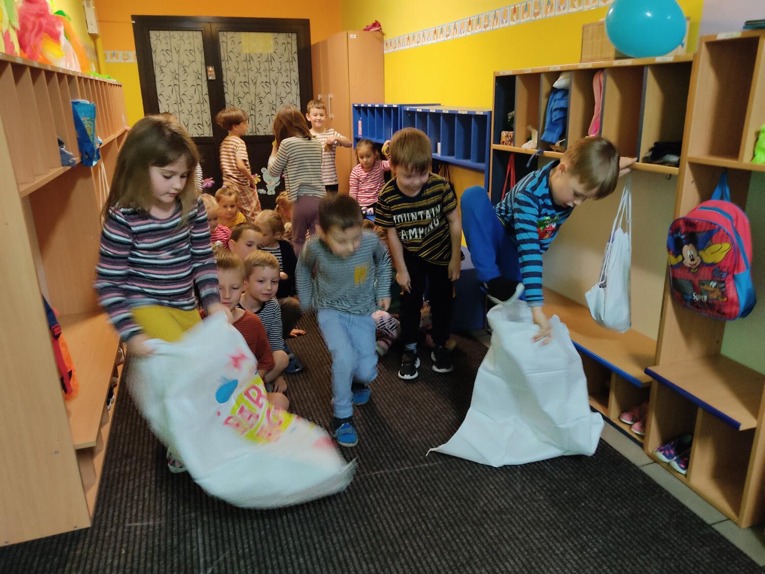Na nockę czekaliśmy z wielkim napięciem. W ten piątkowy wieczór i noc tj. 19.11/20.11.21r spotkanie z Basią się dokonało. Pamiętaliśmy wszyscy by towarzyszyć Basi przyozdobieni w jej ulubione paski, nikt nie zapomniał zabrać z domu paskowych kreacji- zresztą nie skończyło się tylko na paskowej garderobie, czegóż nie było w paski- śpiwory, serwetki, kubeczki, paskowy wybieg i przede wszystkim paskowy tort Basi. Zanim jednak było tradycyjne 100lat dla naszej literackiej solenizantki, to wcześniej każdy z wielką odwagą w sercu przeszedł po wybiegu witając się z Basią, bawiliśmy się w kreatorów paskowej mody- tworząc niepowtarzalne kreacje , dmuchaliśmy kuleczki by udekorować strój Janka i Basi, a jeszcze i potem był wielki konkurs „Jaka jest Basia”- wszyscy okazali się znawcami Basi- dlatego też każdy otrzymał koronę i upominki od Basi w postaci neonowej biżuterii, fascynującej torby na żelki, a i same żelki odszukaliśmy w plenerach przedszkolnych sal po mega ekscytujących zawodach sportowych . Nocny pokaz i zarazem premiera filmu z Basią i czytanie fragmentu książki okazały się ostatnim punktem zabaw. Udaliśmy się do naszej przedszkolnej sypialni i hop do cieplutkich śpiworków. Tak od razu nie zasnęliśmy- były pogaduchy do poduchy i mocne postanowienie – że tej nocy nikt nie zaśnie. To było tak około drugiej nad ranem,…jednak Orfeusz zadbał o nas i zaczarował nas snem. Jakież było nasze zdziwienie rankiem , gdy zerkaliśmy na siebie i zobaczyliśmy pasiaste paseczki na naszych buziach. Mega zadowoleni budziliśmy się , cieszyliśmy się tym , co przeżyliśmy nocą. Ciepłe śniadanko i już tylko czekanie na rodziców uzmysłowiło nam ,że ta przygoda definitywnie dobiegła końca. Dziękujemy Basi za tak cudowną nockę i na pewno o Basi nigdy nie zapomnimy.