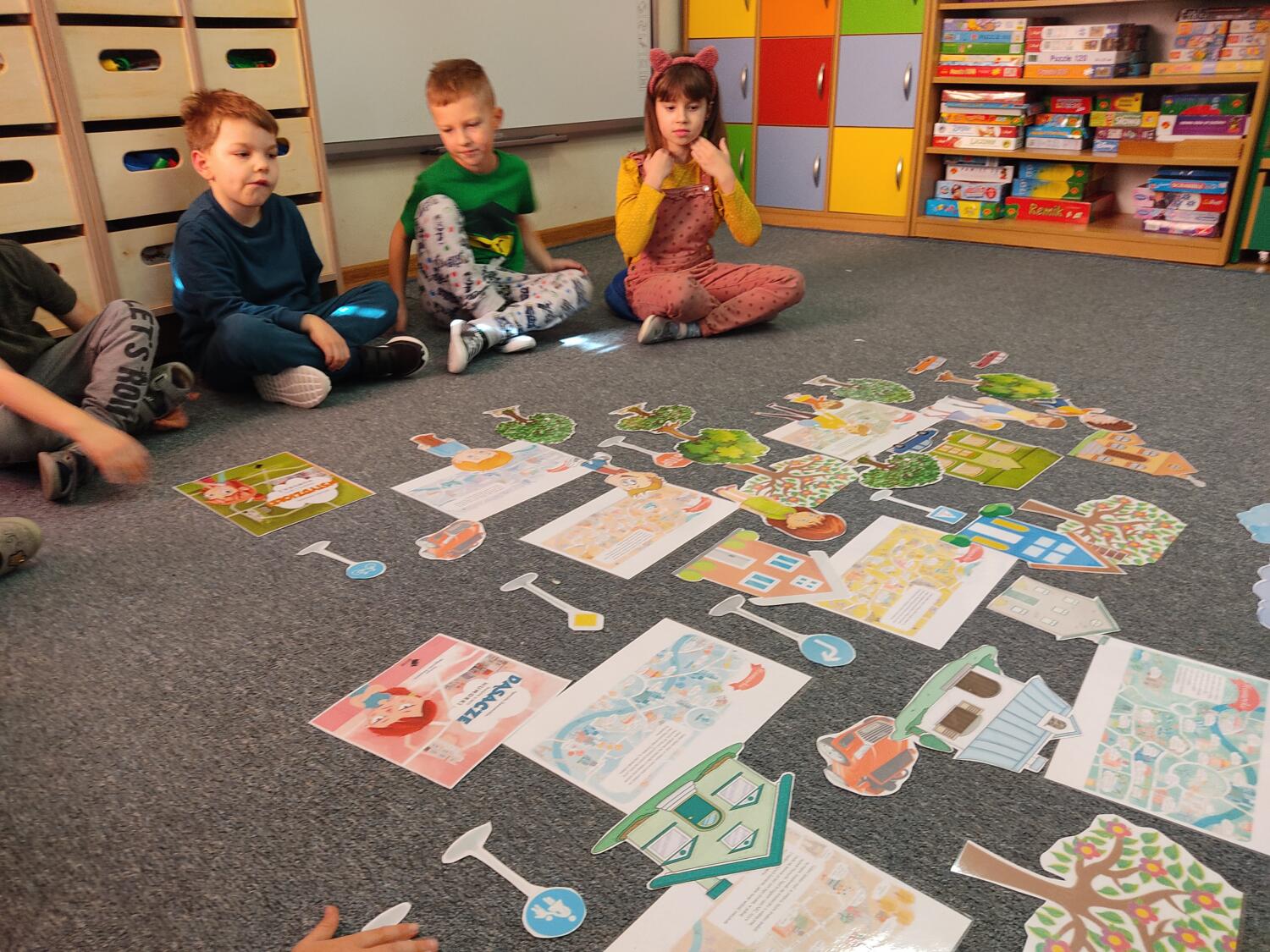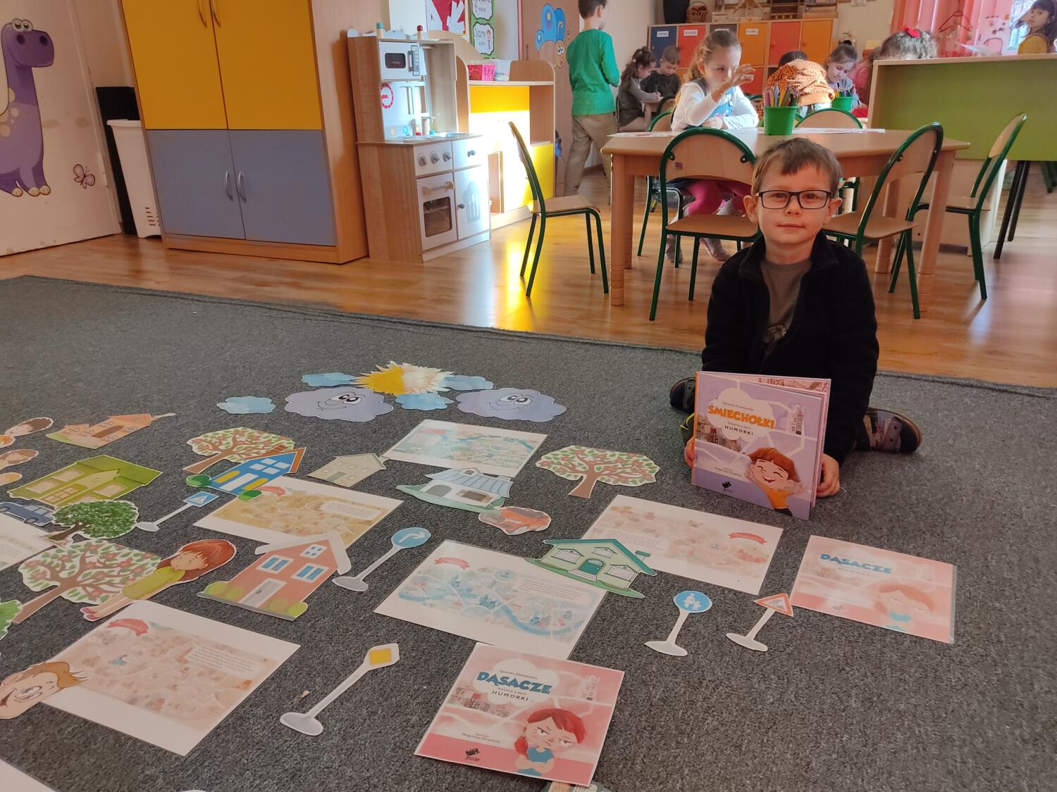 Kolejne nasze spotkanie z mieszkańcami miasteczka Humorki. Gościem dzisiejszego popołudnia była rodzina Śmiechołków. Czytając , dowiedzieliśmy się ,że rodzinie Śmiechołków ktoś kradnie uśmiechy. Co ich teraz czeka? Czy uda im się odnaleźć zgubę i wykryć sprawcę? Rodzina Śmiechołków od zawsze słynęła z dobrego humoru. Pewnego dnia jednak ktoś skradł im uśmiechy. Kto mógł to zrobić? Śmiechołki rozpoczęły prywatne dochodzenie. Z lektury tej zabawnej książeczki dowiedzieliśmy się , jak wywołać na twarzy uśmiech i czym szczery uśmiech różni się od sztucznego.A potem tworzyliśmy makietę miasta Humorki.