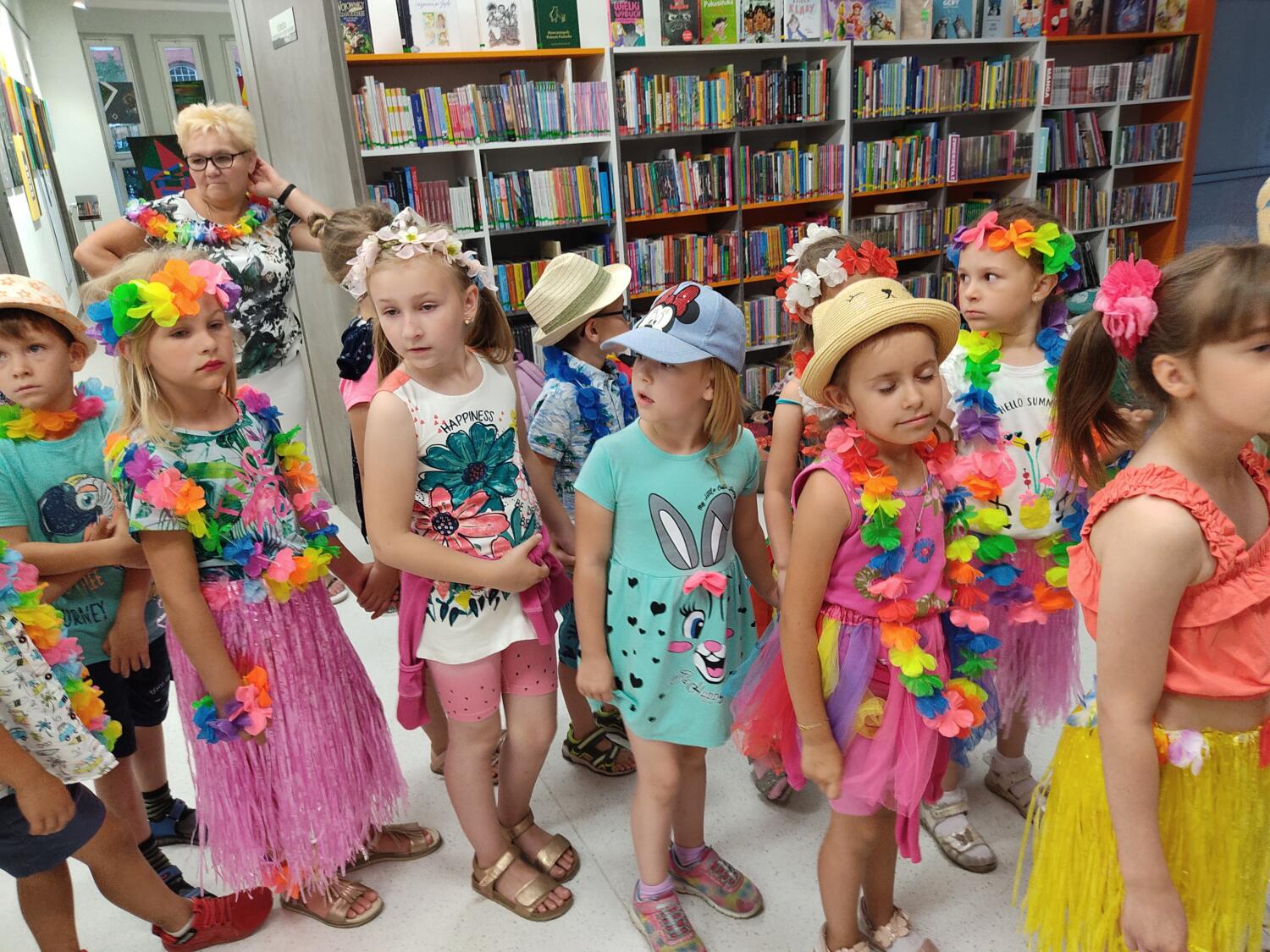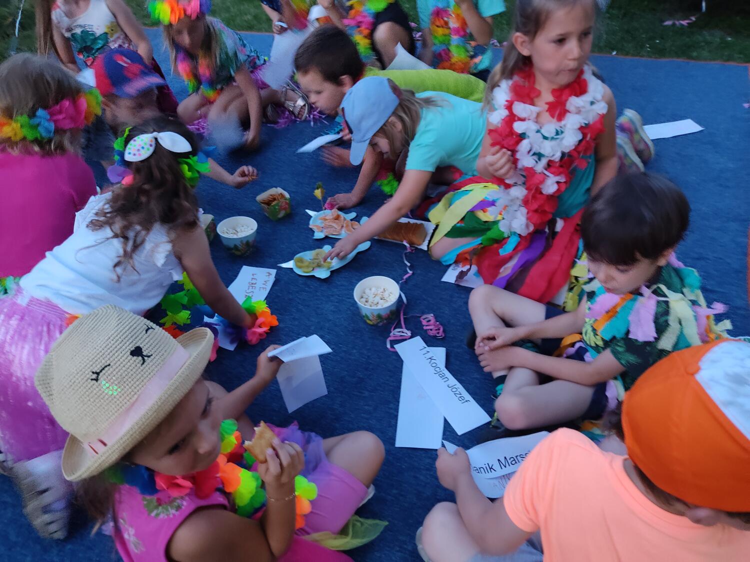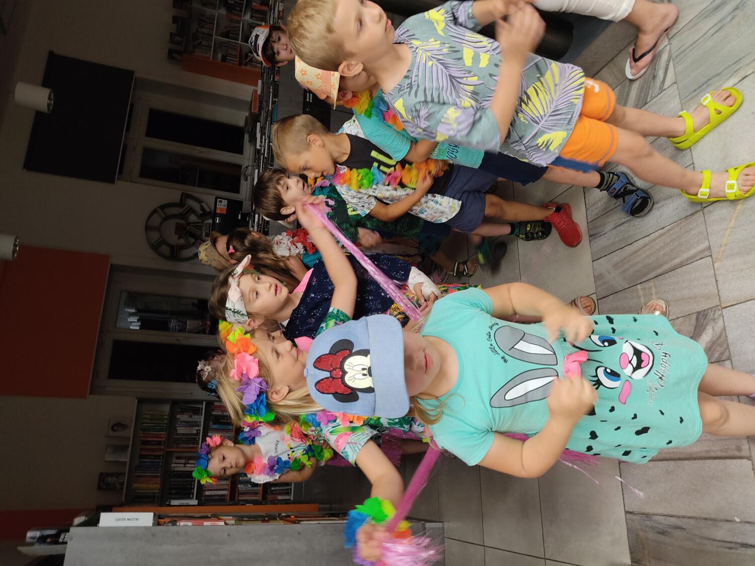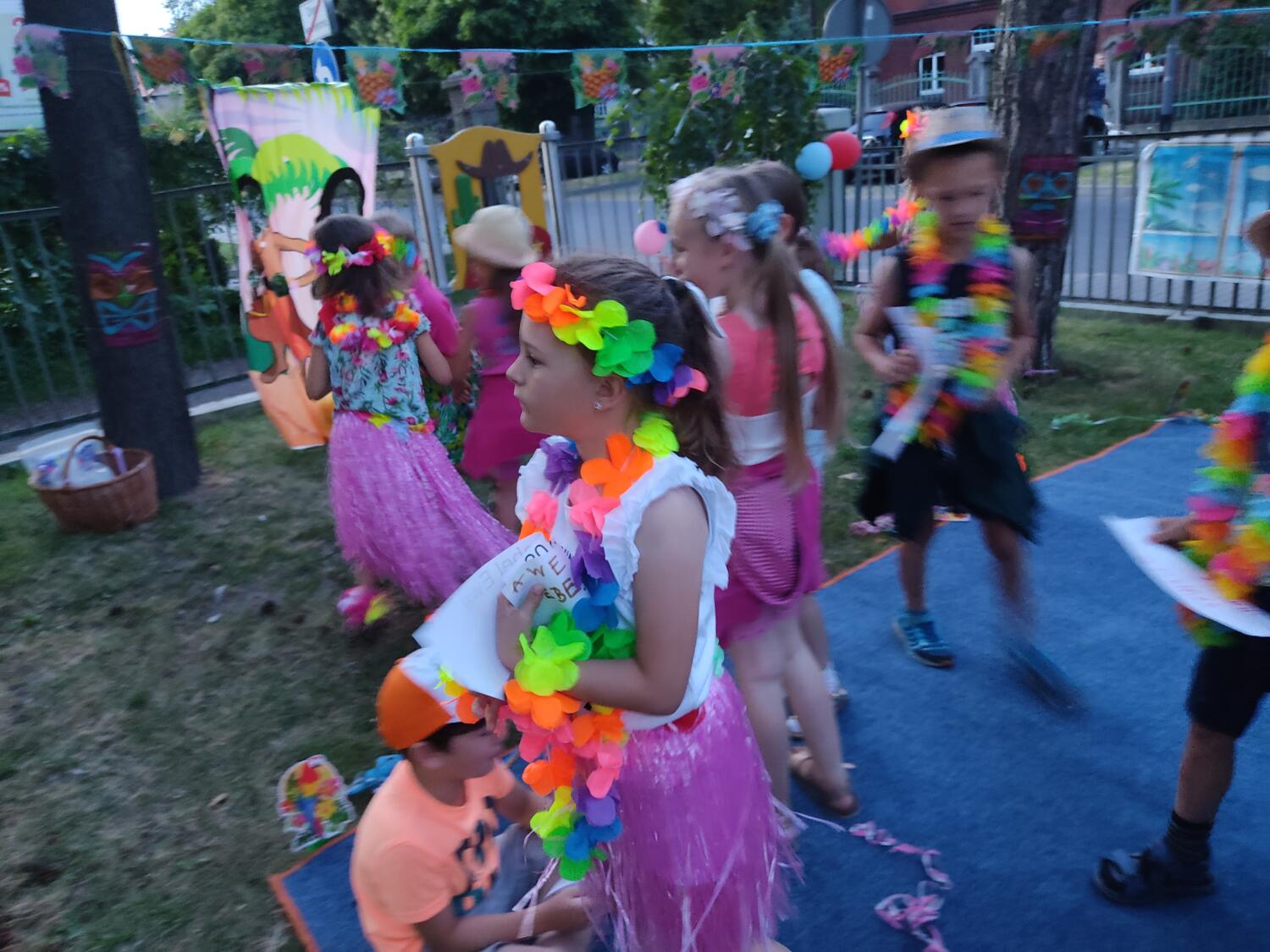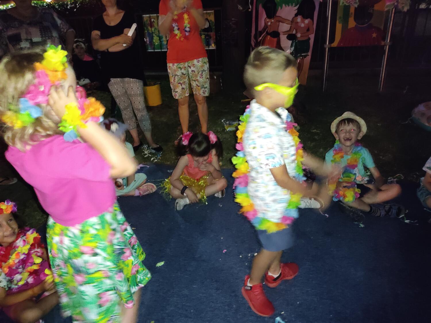 Każdy marzy o wakacjach w tropikach. Udało się spełnić marzenia bystrzaków w ostatni dzień roku szkolnego. Wielobarwne spódniczki i kwiatowe girlandy, kolorowe kapelusze, ubrane przez dzieci, hawajskie rytmy sprawiły, że przedszkolaki szybko poczuły hawajski klimat.Dzieciaki wyruszyły w podróż zabierając niezbędny ekwipunek, jednak na granicy USA przetrzepano naszym podróżnym niejedną torbę i plecak. A i Panie u celników nie miały łatwo, paszporty w końcu zostały podbite i udaliśmy się do hotelu czterogwiazdkowego”NOCKOWANIE. To był jednak dopiero początek pobytu na Hawajach, krętymi zakamarkami zwiedzaliśmy wyspę, by poznać ciekawostki wyspy i biblioteki, doskonale poradziliśmy sobie również z tańcem „hula”, w którym chodzi przede wszystkim o poruszanie biodrami.Uczestnicy zabawy oddali się degustacji pysznych egzotycznych owoców , rozpoznawaliśmy owoce za pomocą zmysłów smaku i dotyku.Były tropikalne konkursy plastyczne- wykonaliśmy biżuterię dla mamusi, lemoniadę na tropikalne upały, kolorową papugę, odczarowaliśmy ducha wulkanu, odbyły się mega zawody z przeszkodami, nie zabrakło bardzo późnych podchodów z papugami , zabaw przy muzyce hawajskiej. Nasze spanko miało swój chyba początek o godzinie 3.20 po seansie kinowym, a rankiem z apetytem, upominkami i dyplomem pamiątkowym oddaliśmy się w wytęsknione ręce rodziców.
