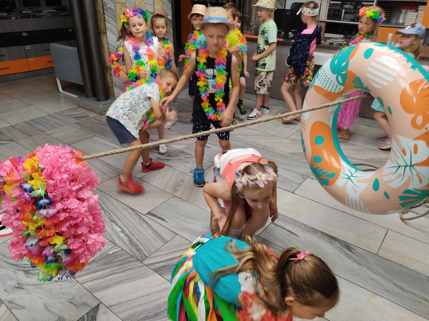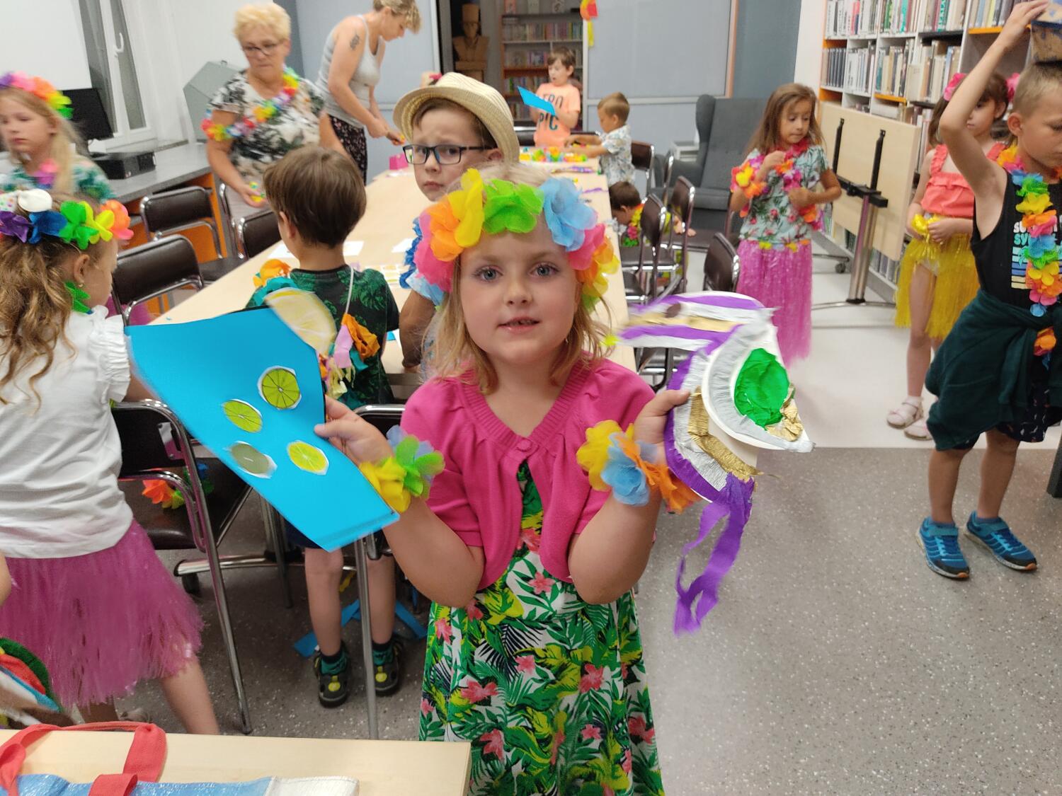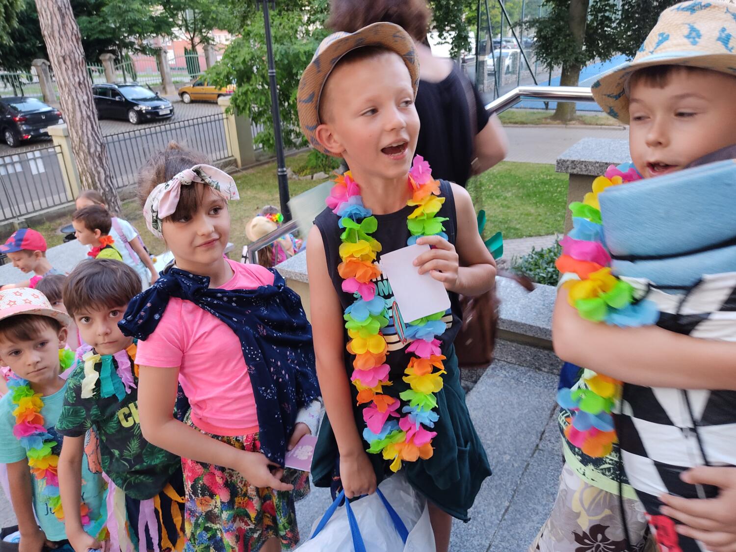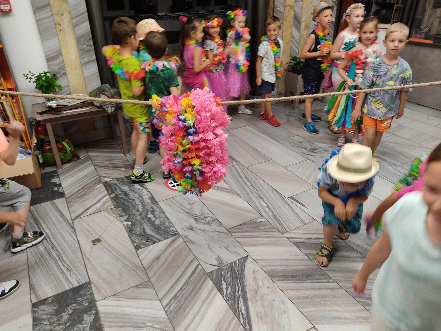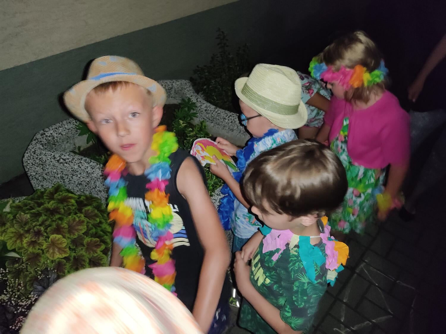 Każdy marzy o wakacjach w tropikach. Udało się spełnić marzenia bystrzaków w ostatni dzień roku szkolnego. Wielobarwne spódniczki i kwiatowe girlandy, kolorowe kapelusze, ubrane przez dzieci, hawajskie rytmy sprawiły, że przedszkolaki szybko poczuły hawajski klimat.Dzieciaki wyruszyły w podróż zabierając niezbędny ekwipunek, jednak na granicy USA przetrzepano naszym podróżnym niejedną torbę i plecak. A i Panie u celników nie miały łatwo, paszporty w końcu zostały podbite i udaliśmy się do hotelu czterogwiazdkowego”NOCKOWANIE. To był jednak dopiero początek pobytu na Hawajach, krętymi zakamarkami zwiedzaliśmy wyspę, by poznać ciekawostki wyspy i biblioteki, doskonale poradziliśmy sobie również z tańcem „hula”, w którym chodzi przede wszystkim o poruszanie biodrami.Uczestnicy zabawy oddali się degustacji pysznych egzotycznych owoców , rozpoznawaliśmy owoce za pomocą zmysłów smaku i dotyku.Były tropikalne konkursy plastyczne- wykonaliśmy biżuterię dla mamusi, lemoniadę na tropikalne upały, kolorową papugę, odczarowaliśmy ducha wulkanu, odbyły się mega zawody z przeszkodami, nie zabrakło bardzo późnych podchodów z papugami , zabaw przy muzyce hawajskiej. Nasze spanko miało swój chyba początek o godzinie 3.20 po seansie kinowym, a rankiem z apetytem, upominkami i dyplomem pamiątkowym oddaliśmy się w wytęsknione ręce rodziców.