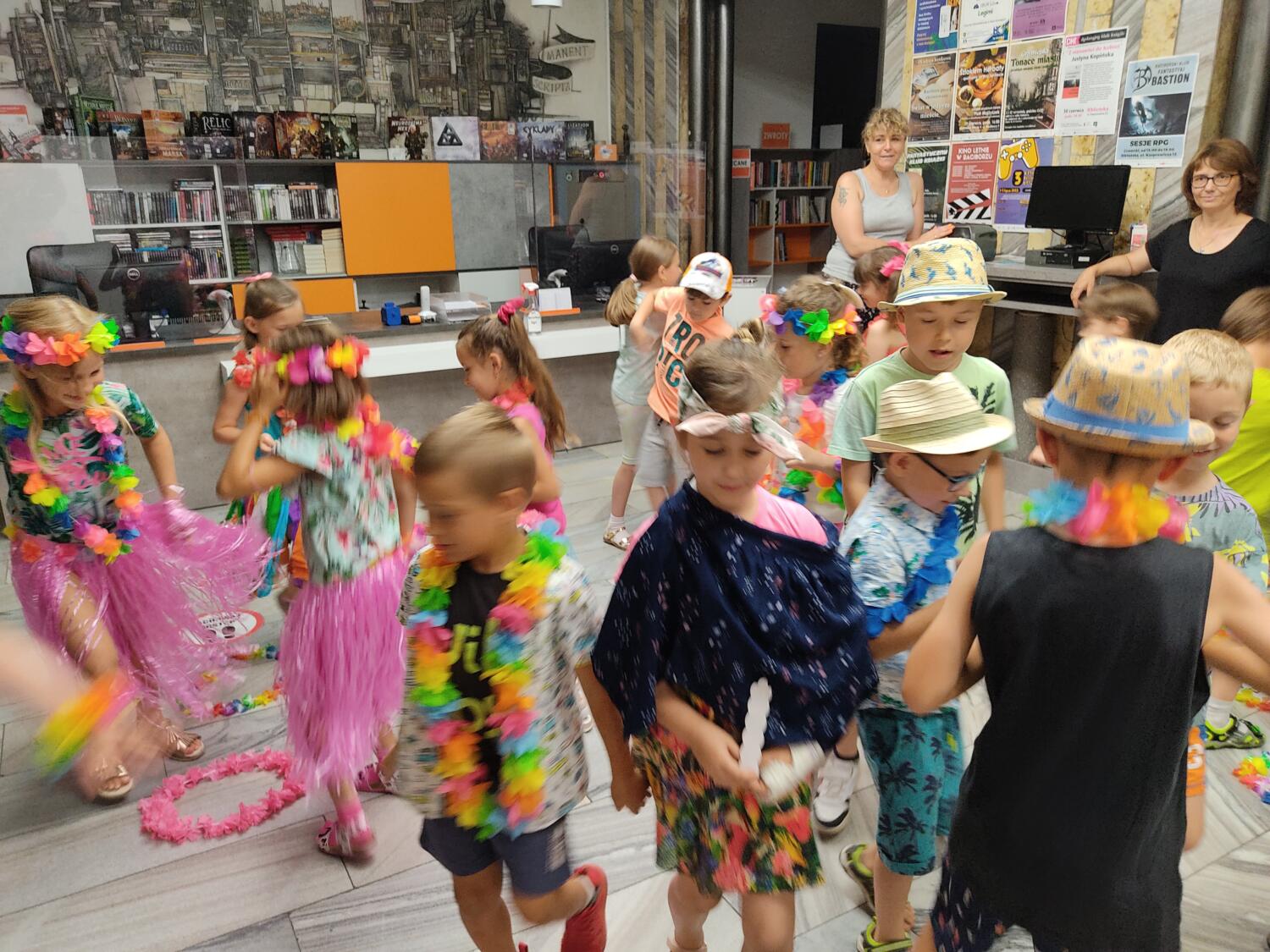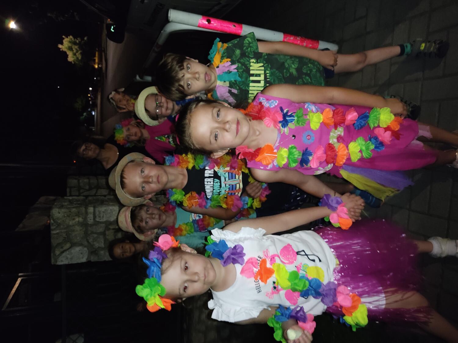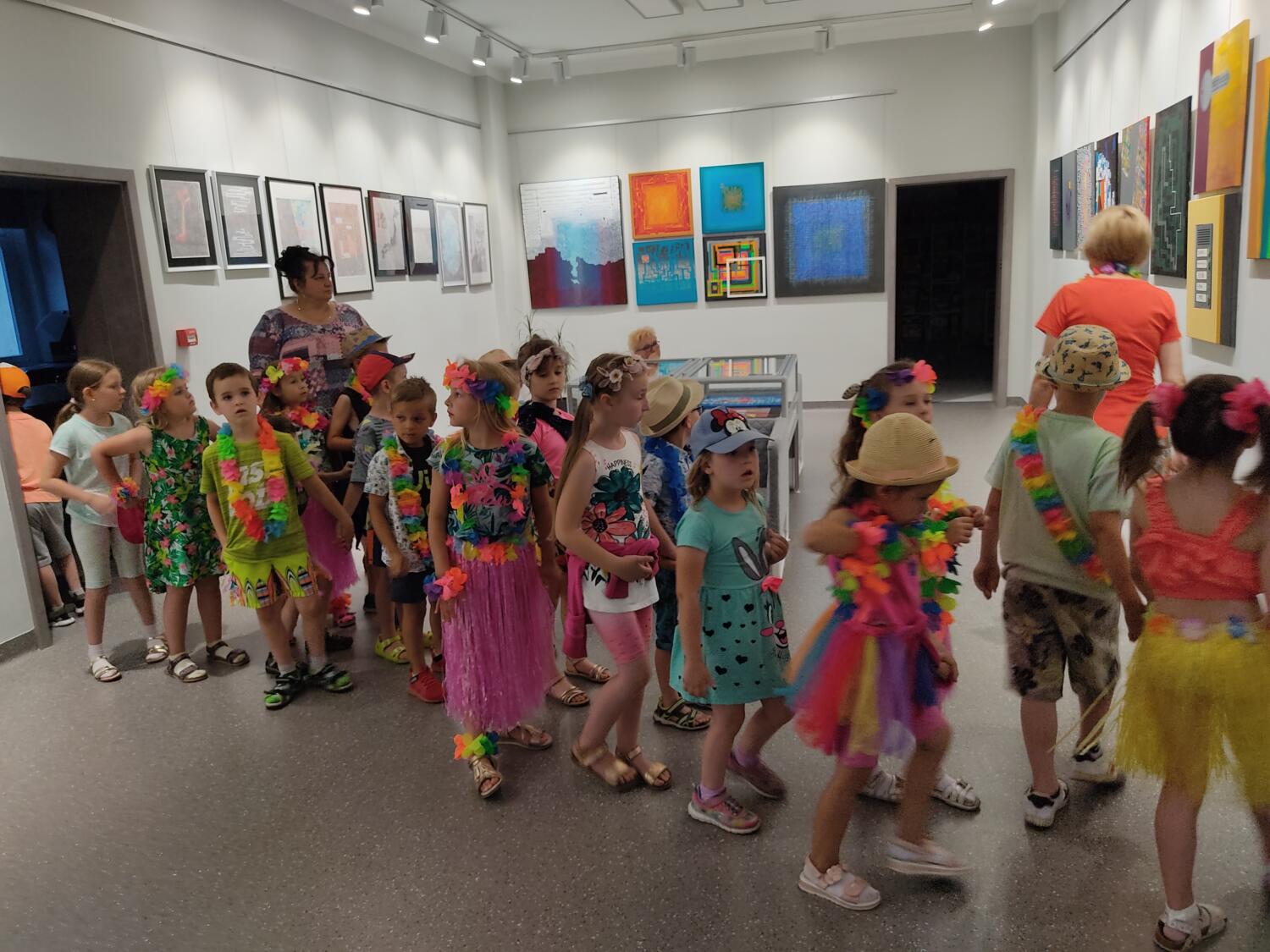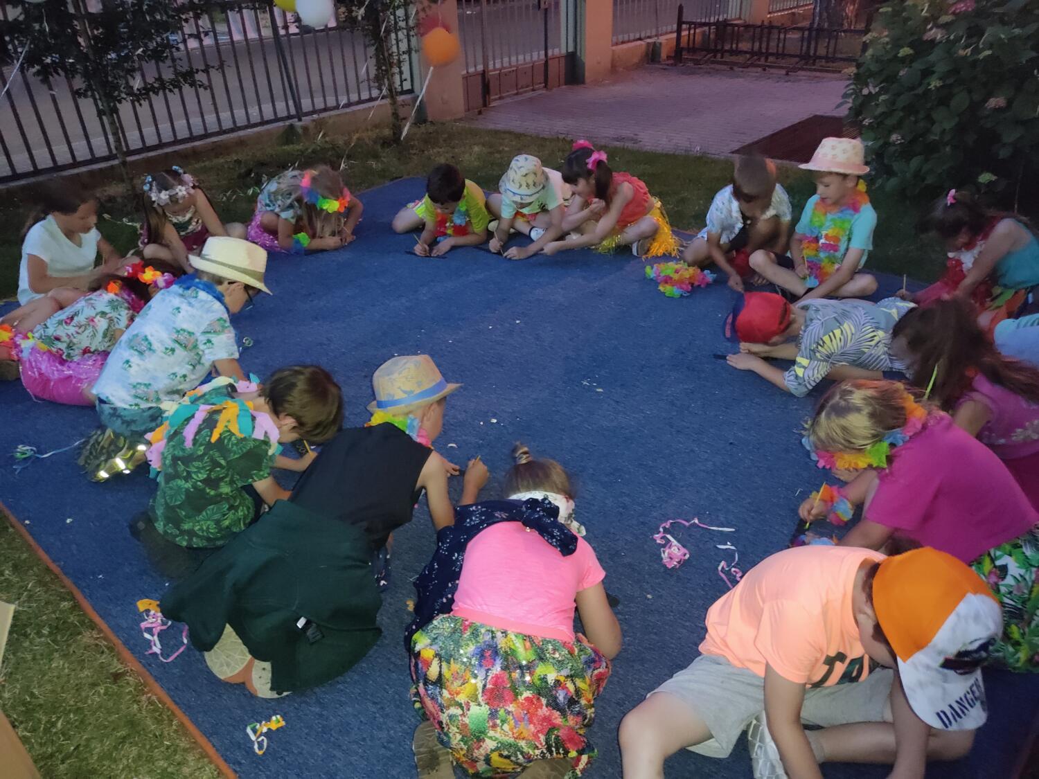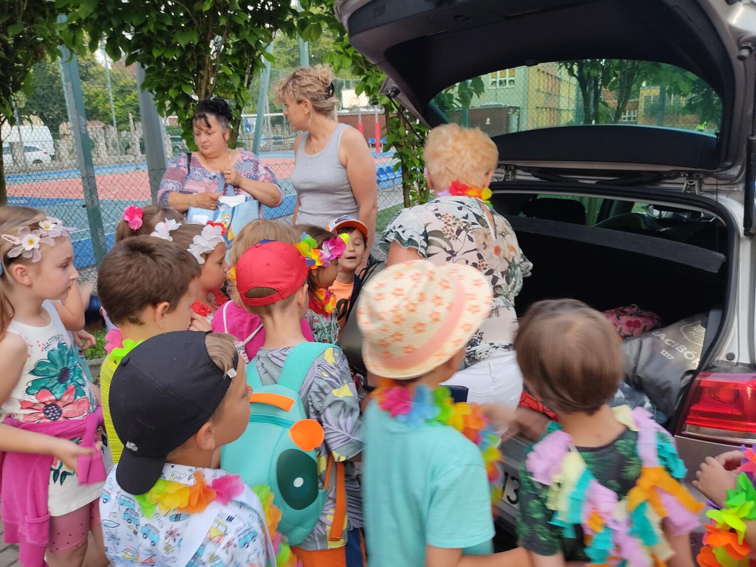 Każdy marzy o wakacjach w tropikach. Udało się spełnić marzenia bystrzaków w ostatni dzień roku szkolnego. Wielobarwne spódniczki i kwiatowe girlandy, kolorowe kapelusze, ubrane przez dzieci, hawajskie rytmy sprawiły, że przedszkolaki szybko poczuły hawajski klimat.Dzieciaki wyruszyły w podróż zabierając niezbędny ekwipunek, jednak na granicy USA przetrzepano naszym podróżnym niejedną torbę i plecak. A i Panie u celników nie miały łatwo, paszporty w końcu zostały podbite i udaliśmy się do hotelu czterogwiazdkowego”NOCKOWANIE. To był jednak dopiero początek pobytu na Hawajach, krętymi zakamarkami zwiedzaliśmy wyspę, by poznać ciekawostki wyspy i biblioteki, doskonale poradziliśmy sobie również z tańcem „hula”, w którym chodzi przede wszystkim o poruszanie biodrami.Uczestnicy zabawy oddali się degustacji pysznych egzotycznych owoców , rozpoznawaliśmy owoce za pomocą zmysłów smaku i dotyku.Były tropikalne konkursy plastyczne- wykonaliśmy biżuterię dla mamusi, lemoniadę na tropikalne upały, kolorową papugę, odczarowaliśmy ducha wulkanu, odbyły się mega zawody z przeszkodami, nie zabrakło bardzo późnych podchodów z papugami , zabaw przy muzyce hawajskiej. Nasze spanko miało swój chyba początek o godzinie 3.20 po seansie kinowym, a rankiem z apetytem, upominkami i dyplomem pamiątkowym oddaliśmy się w wytęsknione ręce rodziców.