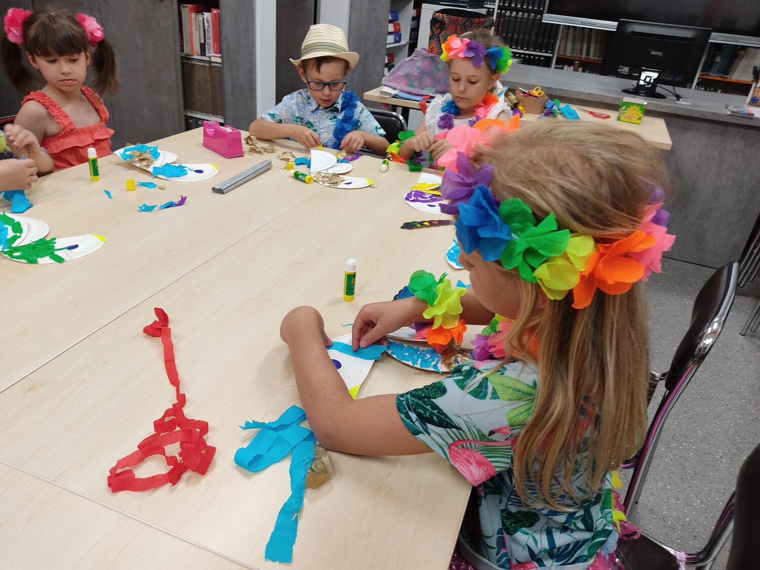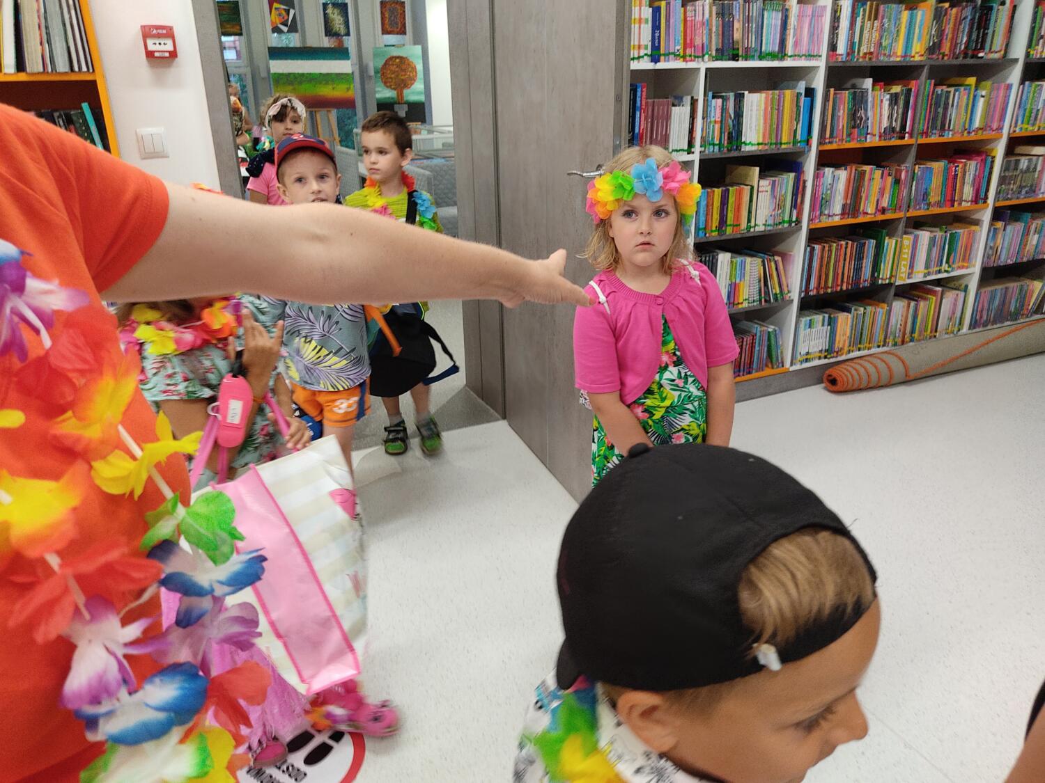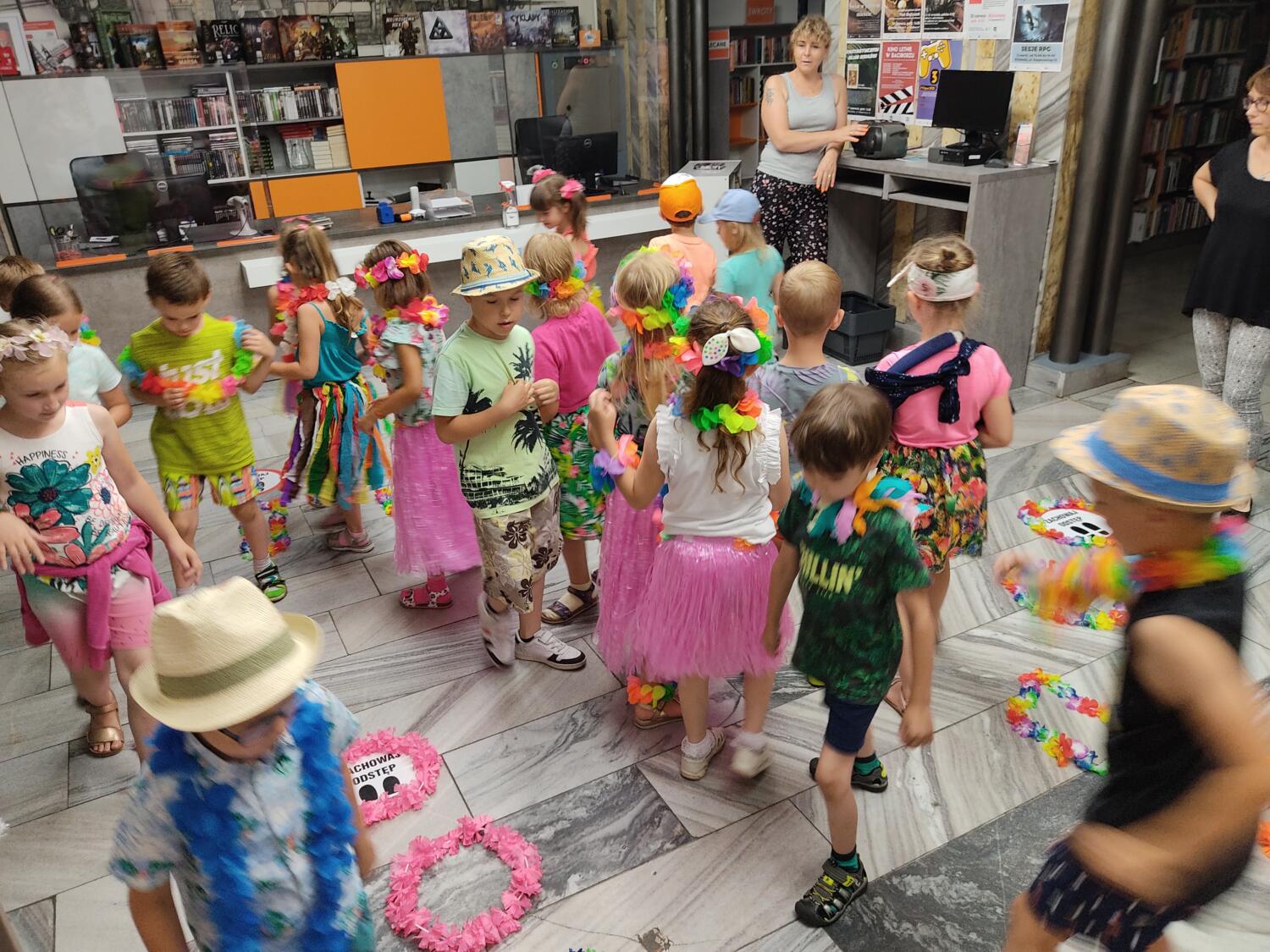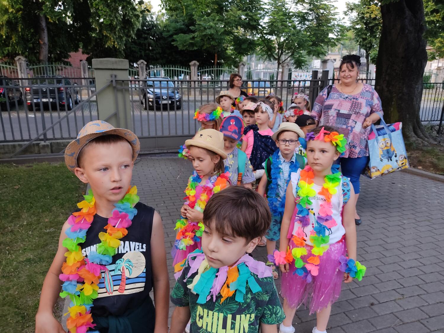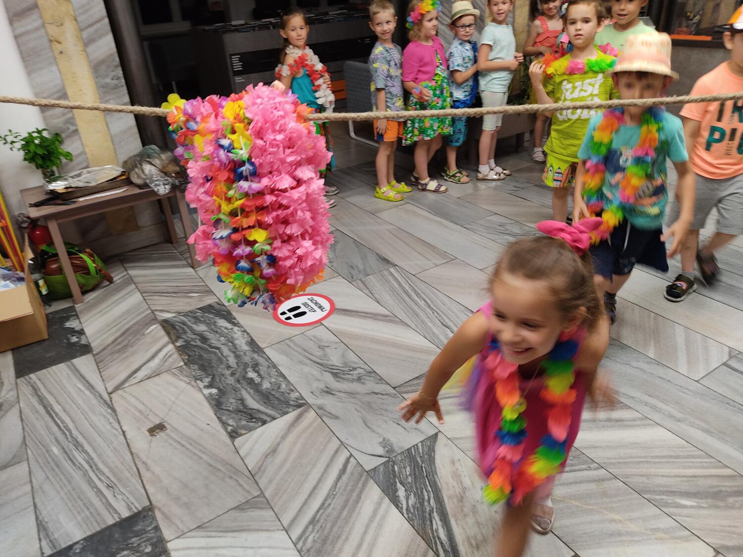 Każdy marzy o wakacjach w tropikach. Udało się spełnić marzenia bystrzaków w ostatni dzień roku szkolnego. Wielobarwne spódniczki i kwiatowe girlandy, kolorowe kapelusze, ubrane przez dzieci, hawajskie rytmy sprawiły, że przedszkolaki szybko poczuły hawajski klimat.Dzieciaki wyruszyły w podróż zabierając niezbędny ekwipunek, jednak na granicy USA przetrzepano naszym podróżnym niejedną torbę i plecak. A i Panie u celników nie miały łatwo, paszporty w końcu zostały podbite i udaliśmy się do hotelu czterogwiazdkowego”NOCKOWANIE. To był jednak dopiero początek pobytu na Hawajach, krętymi zakamarkami zwiedzaliśmy wyspę, by poznać ciekawostki wyspy i biblioteki, doskonale poradziliśmy sobie również z tańcem „hula”, w którym chodzi przede wszystkim o poruszanie biodrami.Uczestnicy zabawy oddali się degustacji pysznych egzotycznych owoców , rozpoznawaliśmy owoce za pomocą zmysłów smaku i dotyku.Były tropikalne konkursy plastyczne- wykonaliśmy biżuterię dla mamusi, lemoniadę na tropikalne upały, kolorową papugę, odczarowaliśmy ducha wulkanu, odbyły się mega zawody z przeszkodami, nie zabrakło bardzo późnych podchodów z papugami , zabaw przy muzyce hawajskiej. Nasze spanko miało swój chyba początek o godzinie 3.20 po seansie kinowym, a rankiem z apetytem, upominkami i dyplomem pamiątkowym oddaliśmy się w wytęsknione ręce rodziców.