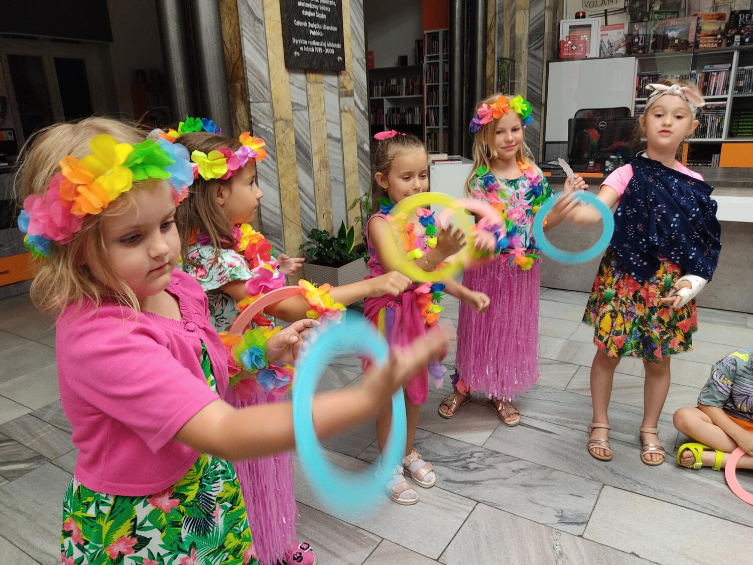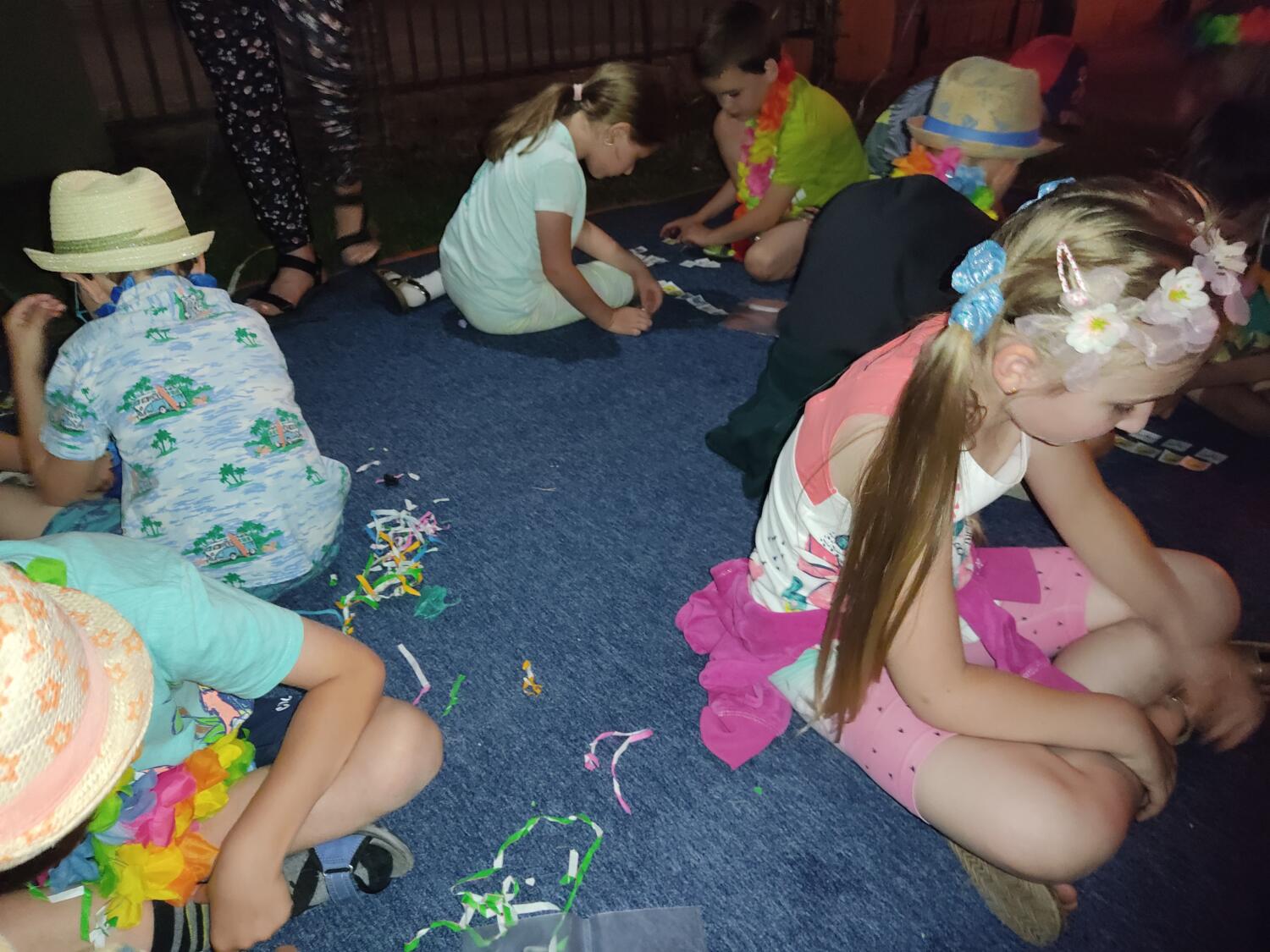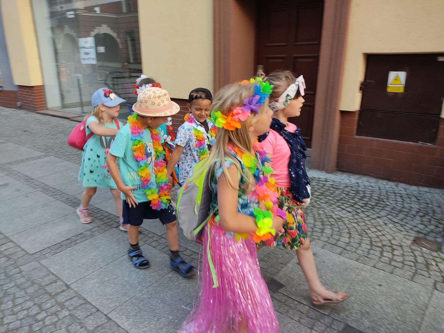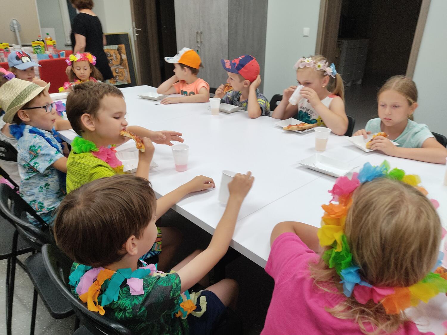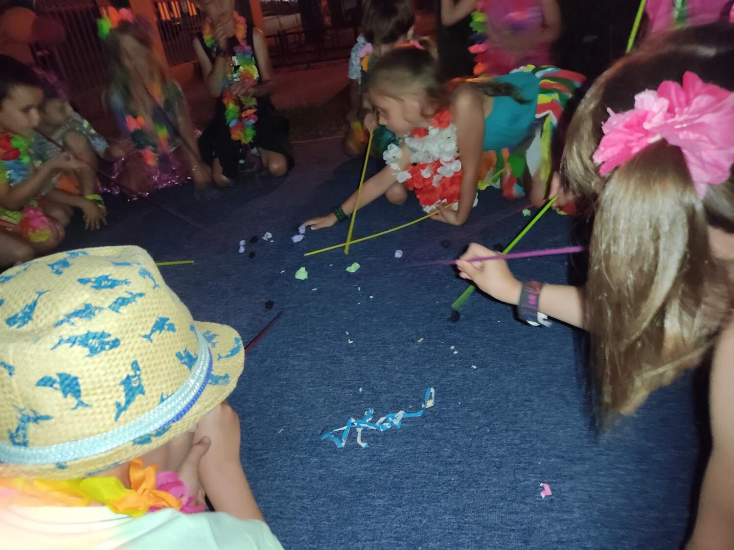 Każdy marzy o wakacjach w tropikach. Udało się spełnić marzenia bystrzaków w ostatni dzień roku szkolnego. Wielobarwne spódniczki i kwiatowe girlandy, kolorowe kapelusze, ubrane przez dzieci, hawajskie rytmy sprawiły, że przedszkolaki szybko poczuły hawajski klimat.Dzieciaki wyruszyły w podróż zabierając niezbędny ekwipunek, jednak na granicy USA przetrzepano naszym podróżnym niejedną torbę i plecak. A i Panie u celników nie miały łatwo, paszporty w końcu zostały podbite i udaliśmy się do hotelu czterogwiazdkowego”NOCKOWANIE. To był jednak dopiero początek pobytu na Hawajach, krętymi zakamarkami zwiedzaliśmy wyspę, by poznać ciekawostki wyspy i biblioteki, doskonale poradziliśmy sobie również z tańcem „hula”, w którym chodzi przede wszystkim o poruszanie biodrami.Uczestnicy zabawy oddali się degustacji pysznych egzotycznych owoców , rozpoznawaliśmy owoce za pomocą zmysłów smaku i dotyku.Były tropikalne konkursy plastyczne- wykonaliśmy biżuterię dla mamusi, lemoniadę na tropikalne upały, kolorową papugę, odczarowaliśmy ducha wulkanu, odbyły się mega zawody z przeszkodami, nie zabrakło bardzo późnych podchodów z papugami , zabaw przy muzyce hawajskiej. Nasze spanko miało swój chyba początek o godzinie 3.20 po seansie kinowym, a rankiem z apetytem, upominkami i dyplomem pamiątkowym oddaliśmy się w wytęsknione ręce rodziców.