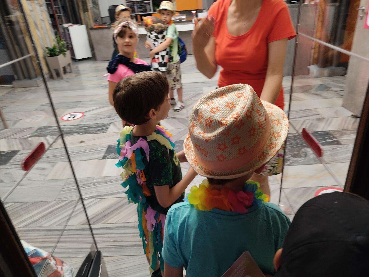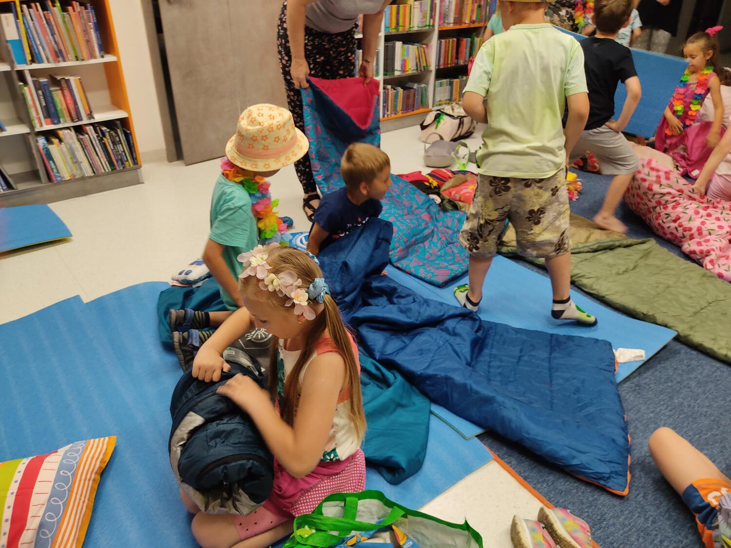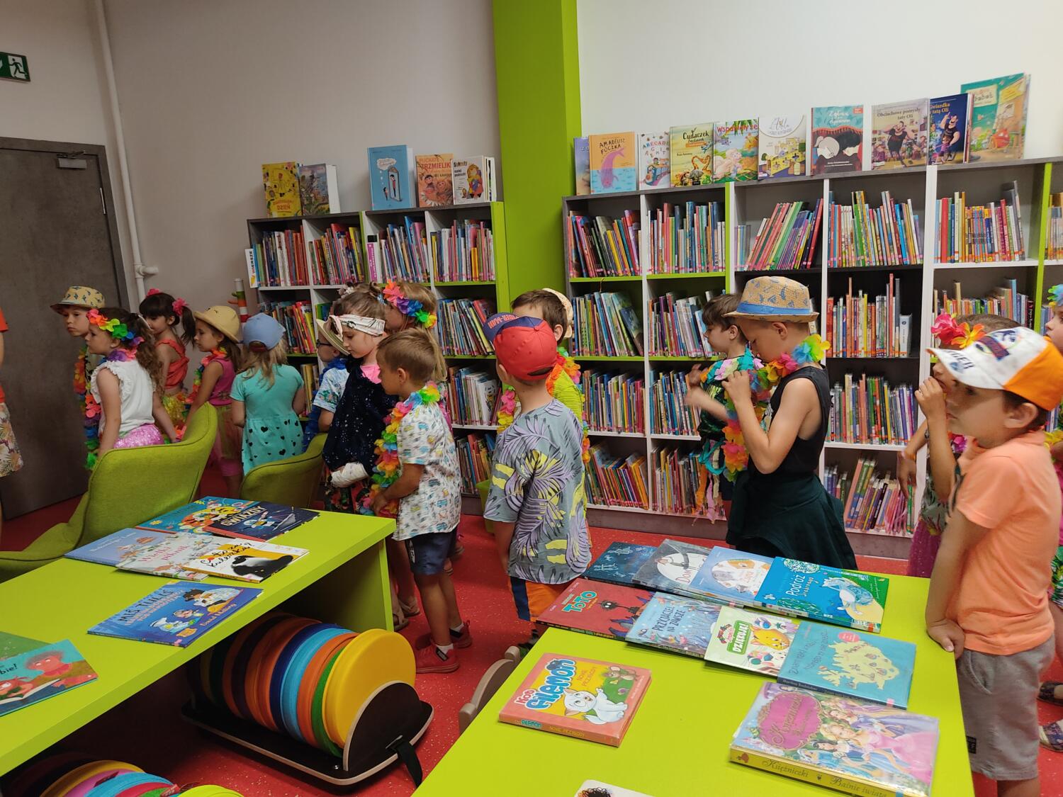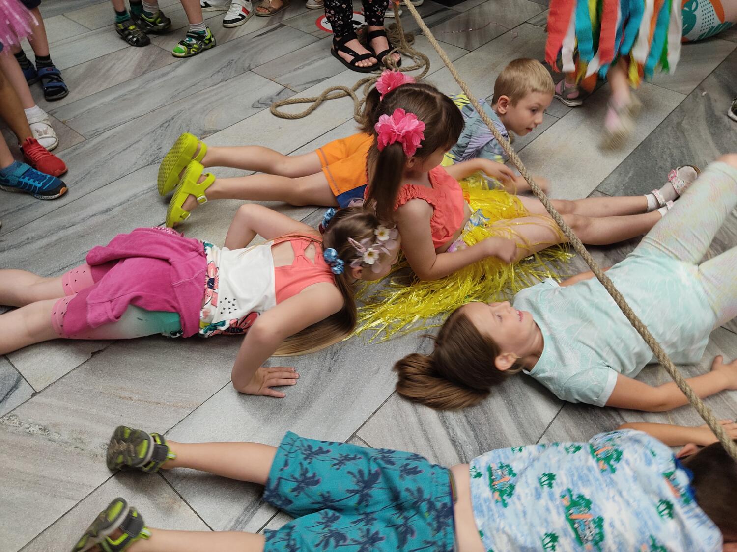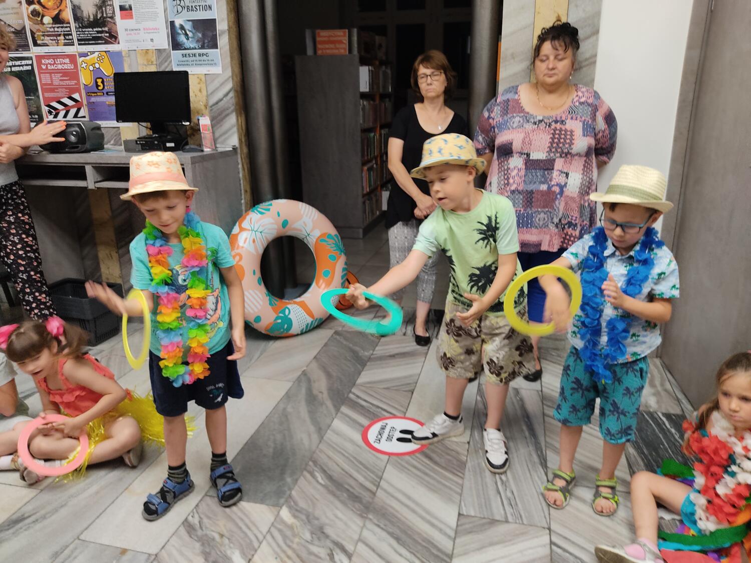 Każdy marzy o wakacjach w tropikach. Udało się spełnić marzenia bystrzaków w ostatni dzień roku szkolnego. Wielobarwne spódniczki i kwiatowe girlandy, kolorowe kapelusze, ubrane przez dzieci, hawajskie rytmy sprawiły, że przedszkolaki szybko poczuły hawajski klimat.Dzieciaki wyruszyły w podróż zabierając niezbędny ekwipunek, jednak na granicy USA przetrzepano naszym podróżnym niejedną torbę i plecak. A i Panie u celników nie miały łatwo, paszporty w końcu zostały podbite i udaliśmy się do hotelu czterogwiazdkowego”NOCKOWANIE. To był jednak dopiero początek pobytu na Hawajach, krętymi zakamarkami zwiedzaliśmy wyspę, by poznać ciekawostki wyspy i biblioteki, doskonale poradziliśmy sobie również z tańcem „hula”, w którym chodzi przede wszystkim o poruszanie biodrami.Uczestnicy zabawy oddali się degustacji pysznych egzotycznych owoców , rozpoznawaliśmy owoce za pomocą zmysłów smaku i dotyku.Były tropikalne konkursy plastyczne- wykonaliśmy biżuterię dla mamusi, lemoniadę na tropikalne upały, kolorową papugę, odczarowaliśmy ducha wulkanu, odbyły się mega zawody z przeszkodami, nie zabrakło bardzo późnych podchodów z papugami , zabaw przy muzyce hawajskiej. Nasze spanko miało swój chyba początek o godzinie 3.20 po seansie kinowym, a rankiem z apetytem, upominkami i dyplomem pamiątkowym oddaliśmy się w wytęsknione ręce rodziców.