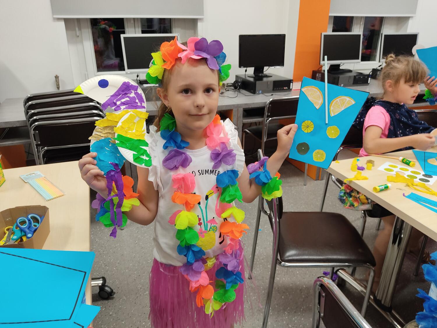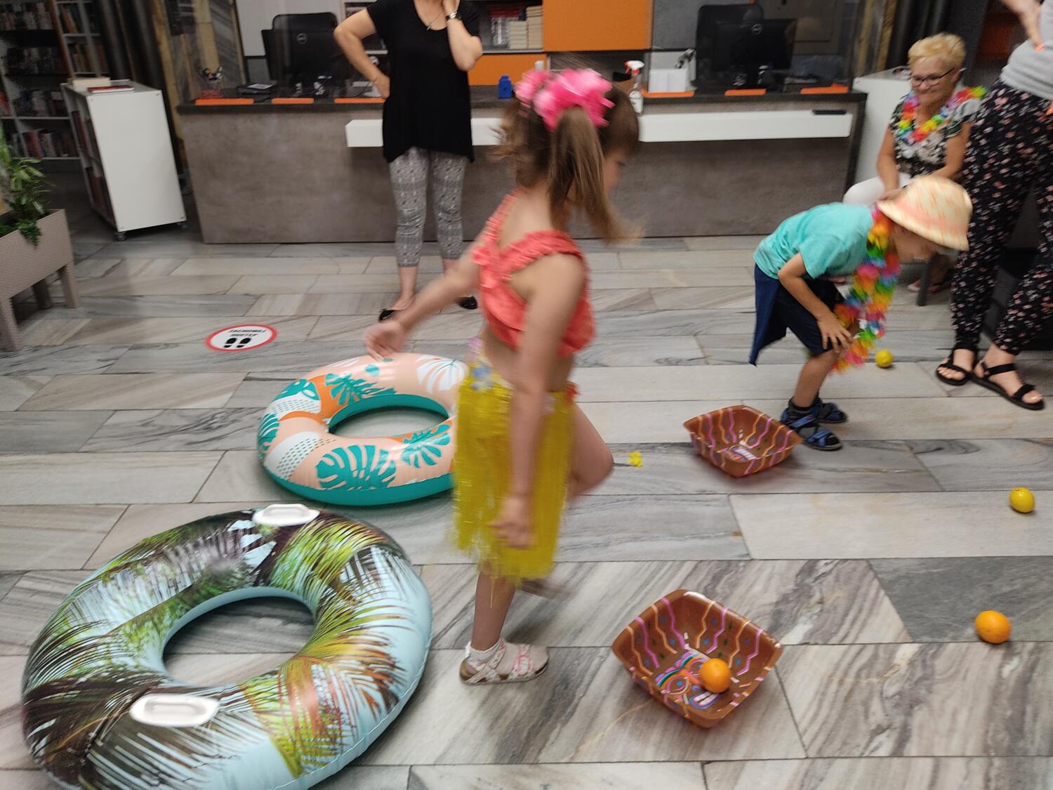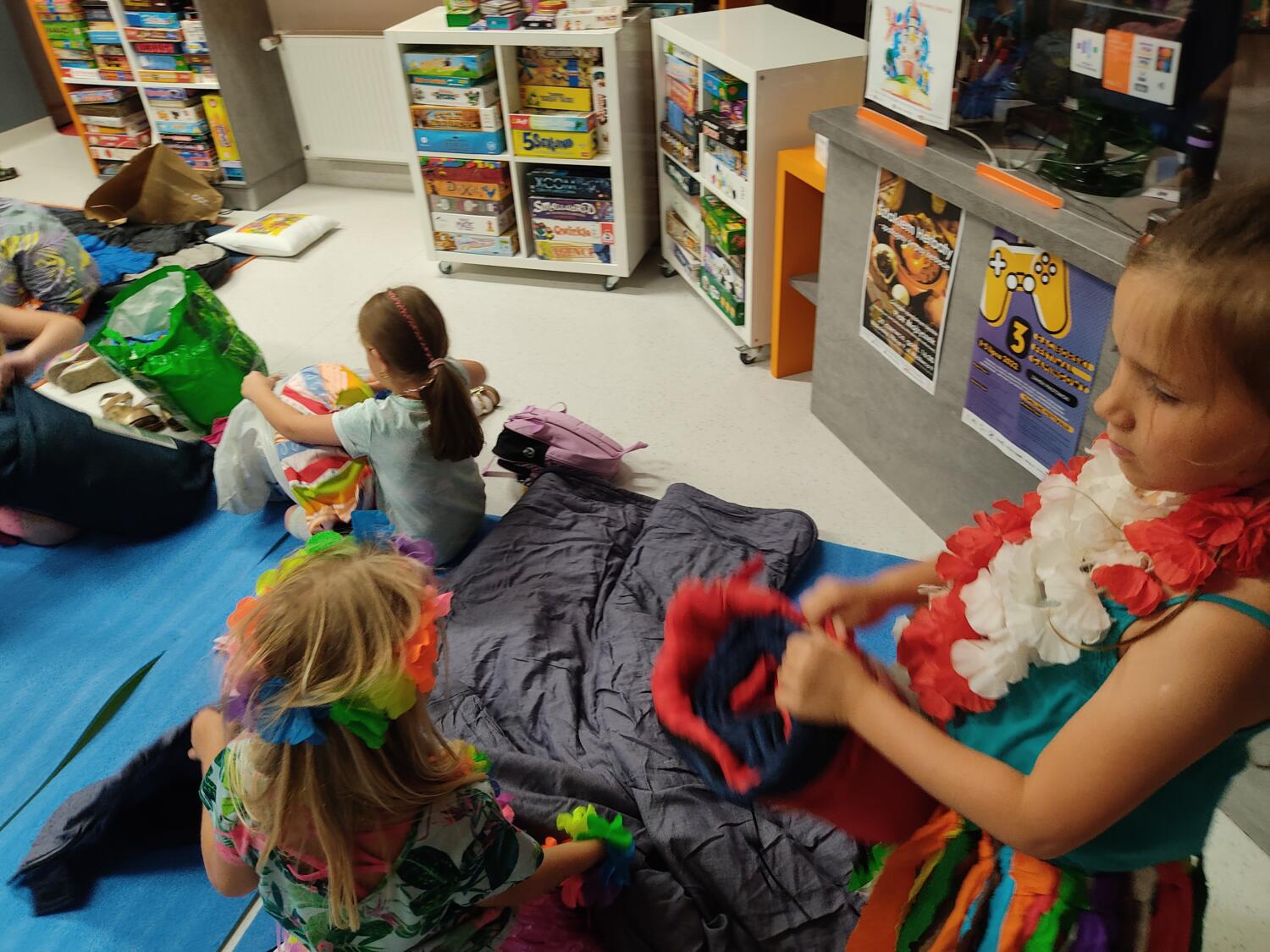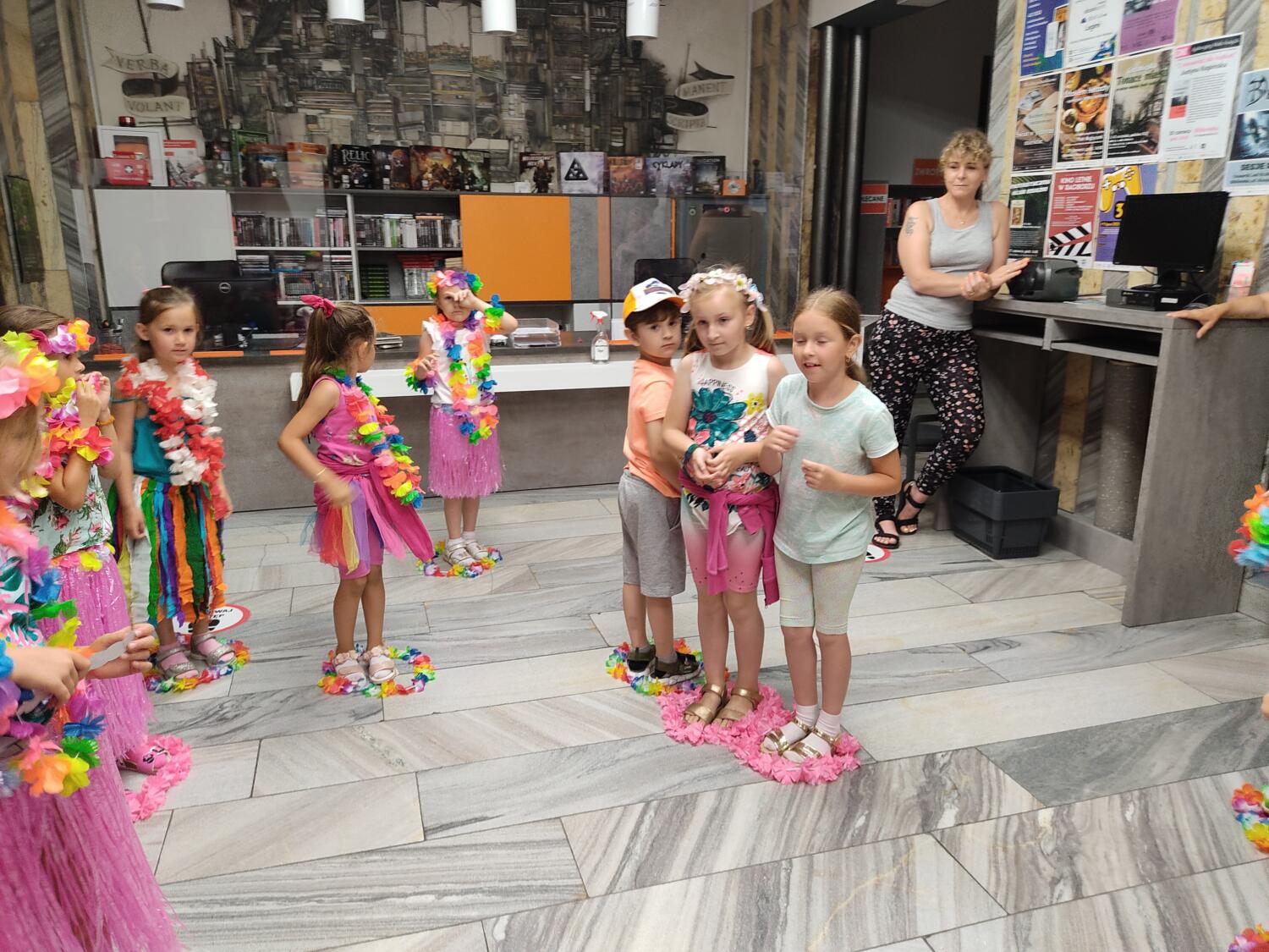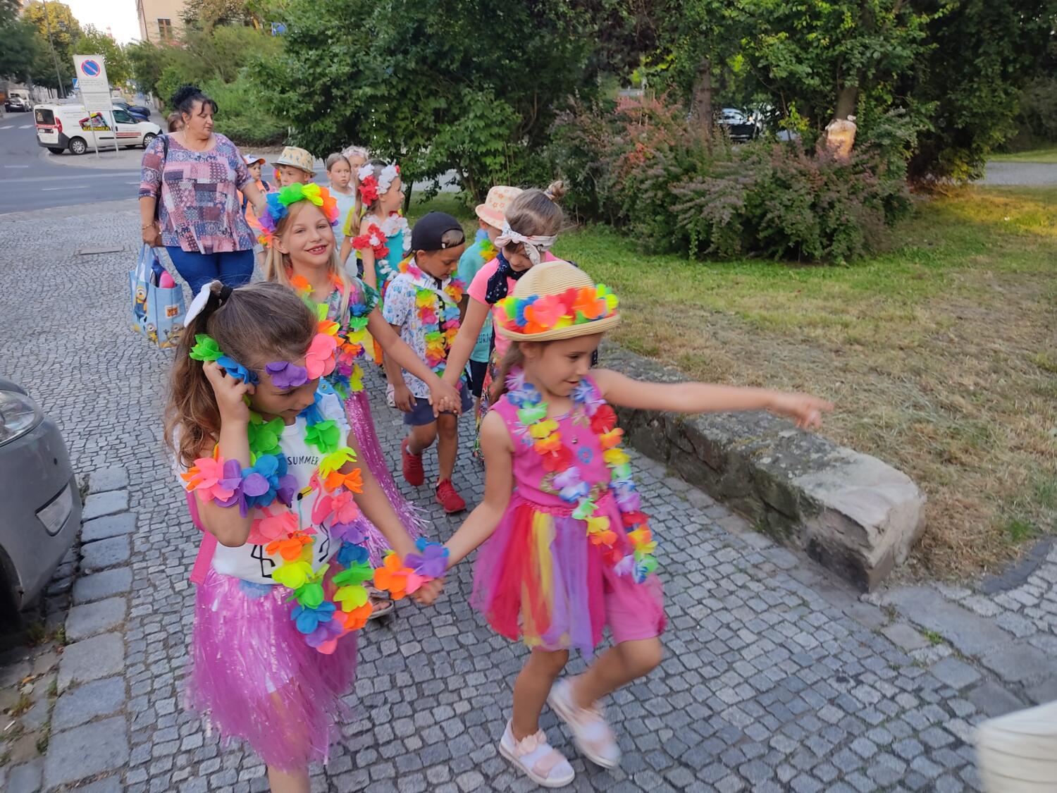 Każdy marzy o wakacjach w tropikach. Udało się spełnić marzenia bystrzaków w ostatni dzień roku szkolnego. Wielobarwne spódniczki i kwiatowe girlandy, kolorowe kapelusze, ubrane przez dzieci, hawajskie rytmy sprawiły, że przedszkolaki szybko poczuły hawajski klimat.Dzieciaki wyruszyły w podróż zabierając niezbędny ekwipunek, jednak na granicy USA przetrzepano naszym podróżnym niejedną torbę i plecak. A i Panie u celników nie miały łatwo, paszporty w końcu zostały podbite i udaliśmy się do hotelu czterogwiazdkowego”NOCKOWANIE. To był jednak dopiero początek pobytu na Hawajach, krętymi zakamarkami zwiedzaliśmy wyspę, by poznać ciekawostki wyspy i biblioteki, doskonale poradziliśmy sobie również z tańcem „hula”, w którym chodzi przede wszystkim o poruszanie biodrami.Uczestnicy zabawy oddali się degustacji pysznych egzotycznych owoców , rozpoznawaliśmy owoce za pomocą zmysłów smaku i dotyku.Były tropikalne konkursy plastyczne- wykonaliśmy biżuterię dla mamusi, lemoniadę na tropikalne upały, kolorową papugę, odczarowaliśmy ducha wulkanu, odbyły się mega zawody z przeszkodami, nie zabrakło bardzo późnych podchodów z papugami , zabaw przy muzyce hawajskiej. Nasze spanko miało swój chyba początek o godzinie 3.20 po seansie kinowym, a rankiem z apetytem, upominkami i dyplomem pamiątkowym oddaliśmy się w wytęsknione ręce rodziców.