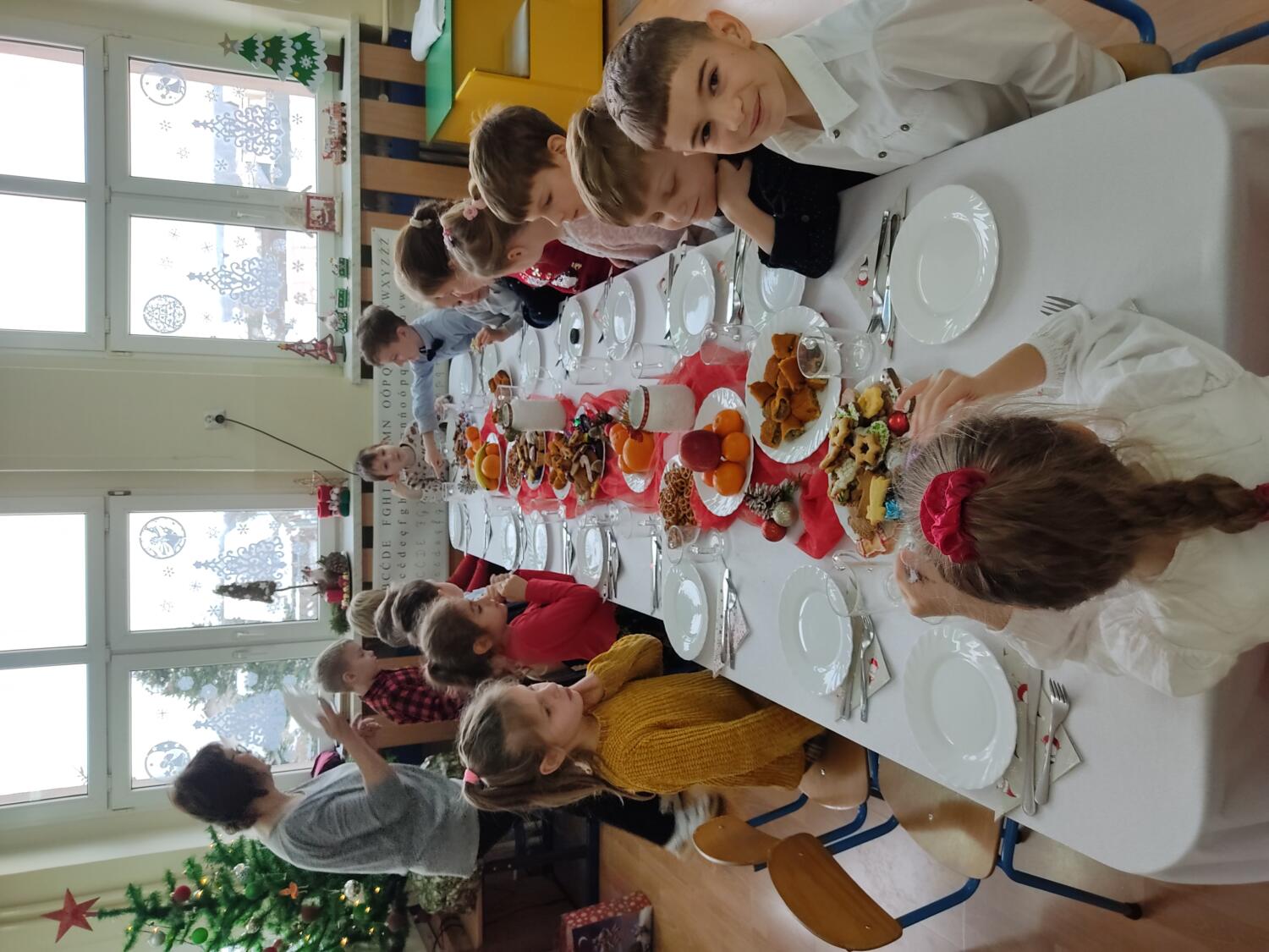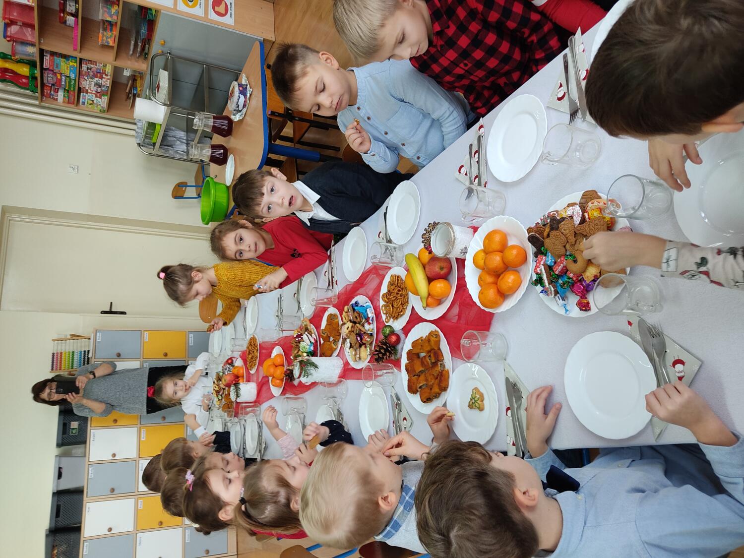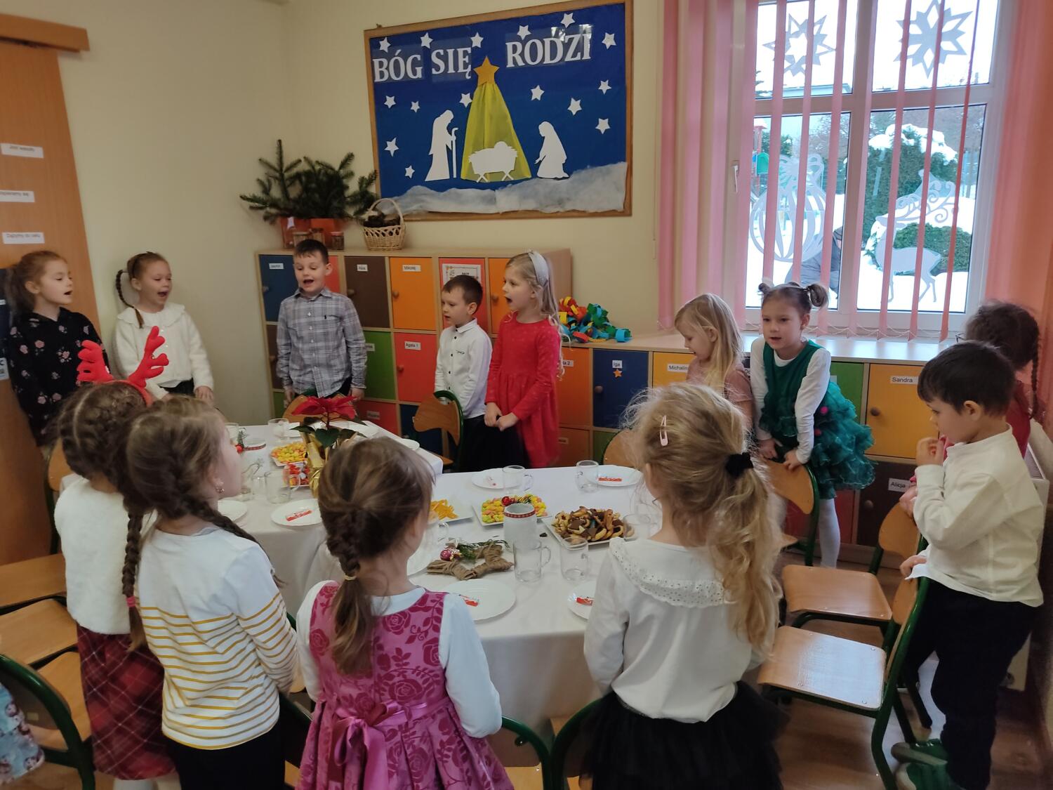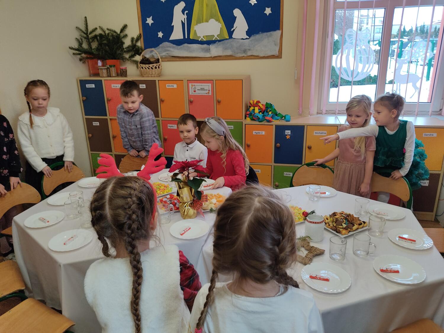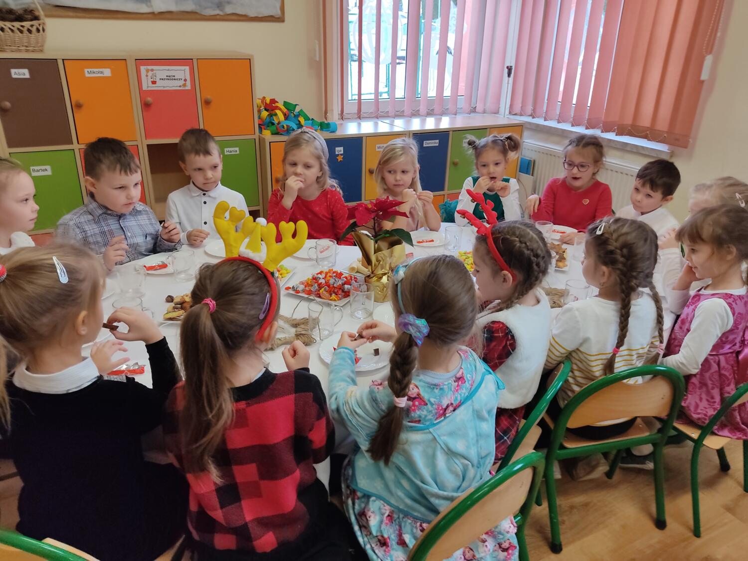 2o grudnia w naszym przedszkolu obchodziliśmy jeden z najpiękniejszych dni w roku – Wigilię Bożego Narodzenia. W salach przedszkolnych dzieci dzieliły się opłatkiem, składały sobie życzenia, a następnie zasiadły do pięknie przystrojonych stołów, na których czekał świąteczny poczęstunek- ciasteczka i owoce przyniesione przez rodziców. Nie zabrakło również wspólnego śpiewania kolęd i pastorałek.
