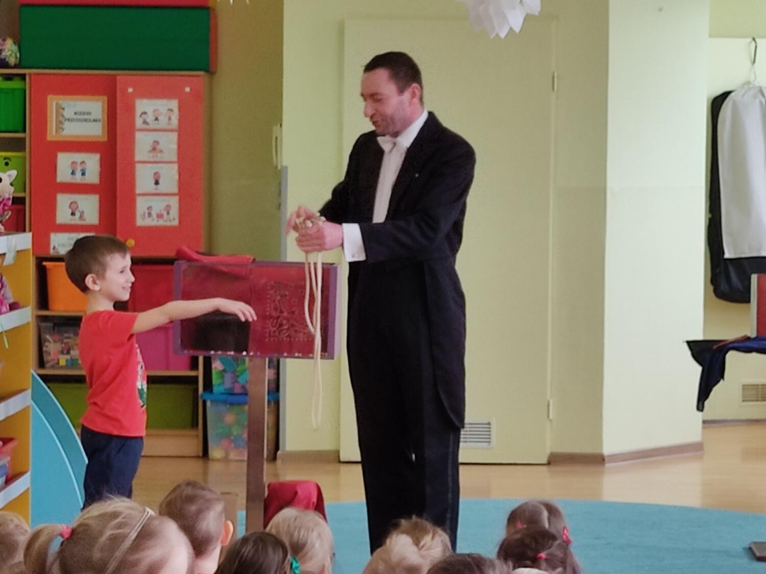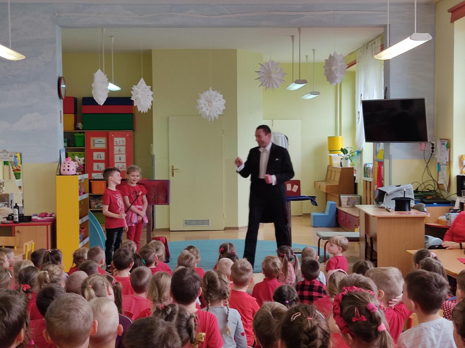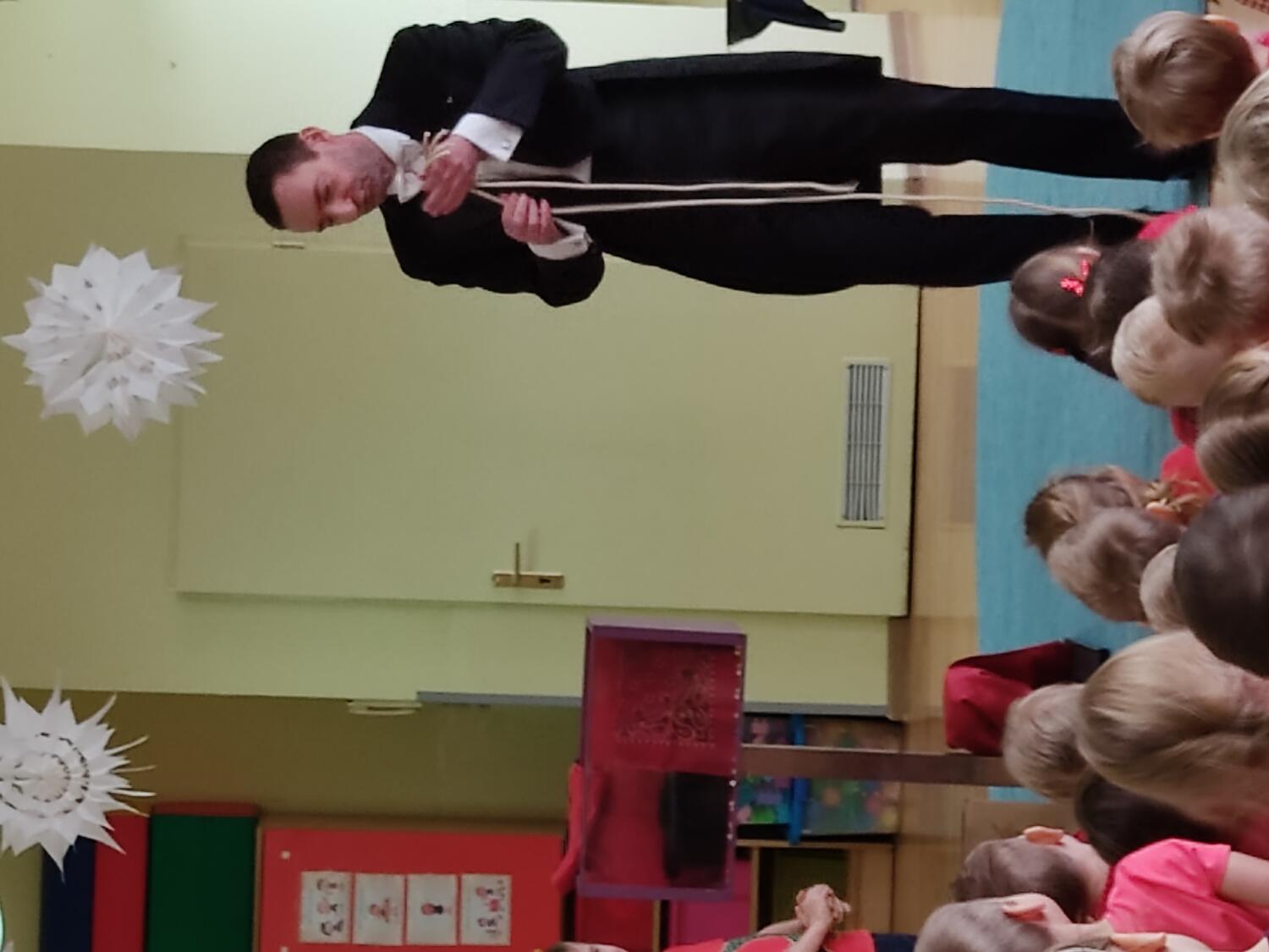 Trochę magii, trochę sztuczek, dużo wyobraźni i już… z kapelusza wyszedł królik. A wszystko to za sprawą iluzjonisty Mario, który odwiedził nas w przedszkolu. Wizyta ta odbyła się w dniu szczególnym , bo w Walentynki. Nasz iluzjonista Mario czarował publiczność przedszkolną wraz z nowo przybyłymi kandydatami do przedszkola, oj działo się. Czary mary,hokus pokus sim sala bim.A psik !!!!!??????. Dziekujemy Radzie Rodziców za ufundowanie tego magicznego widowiska.