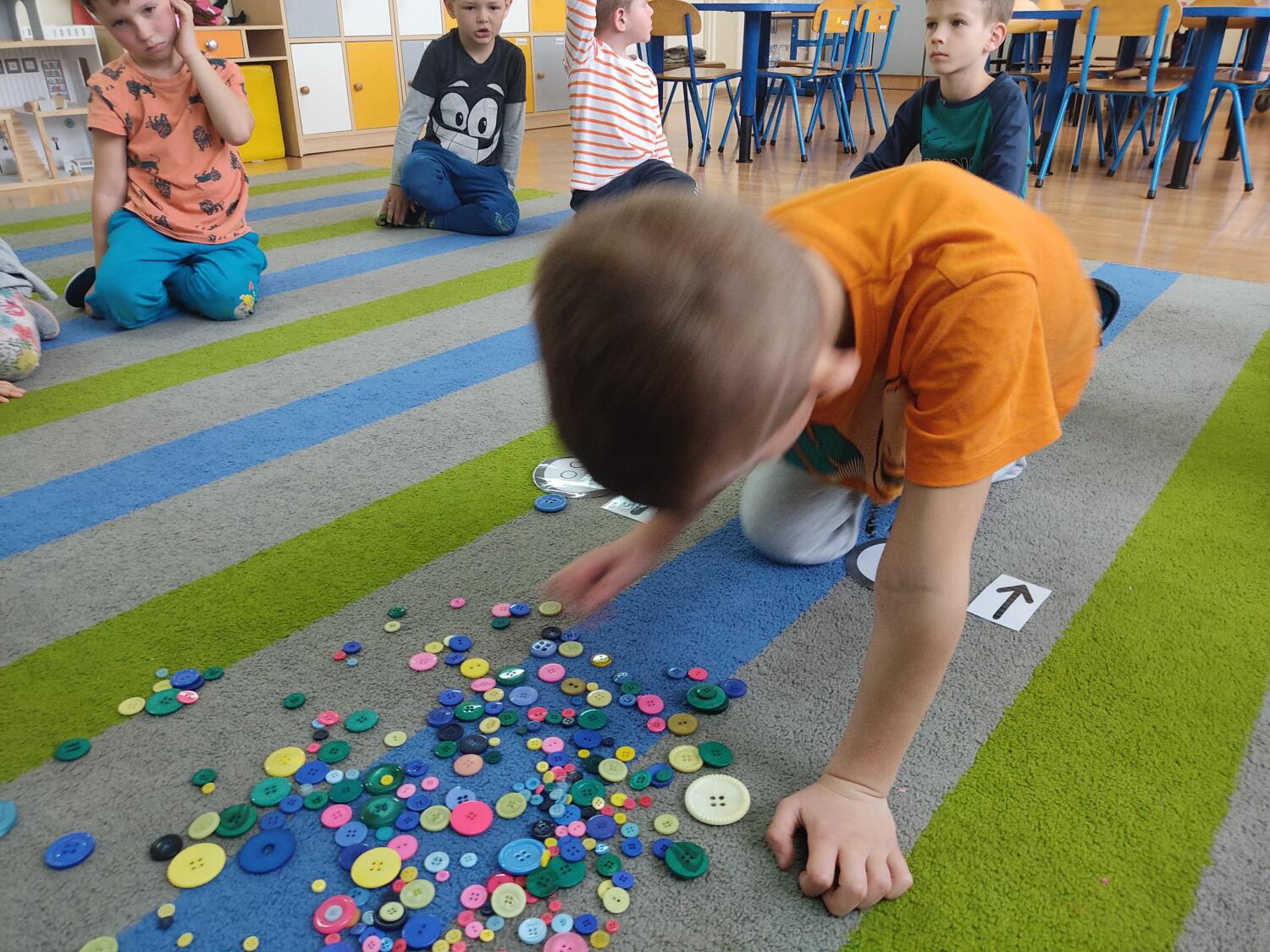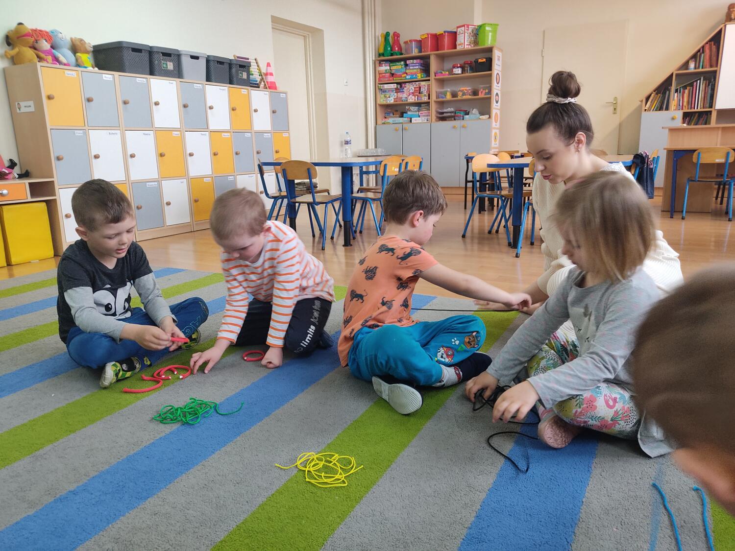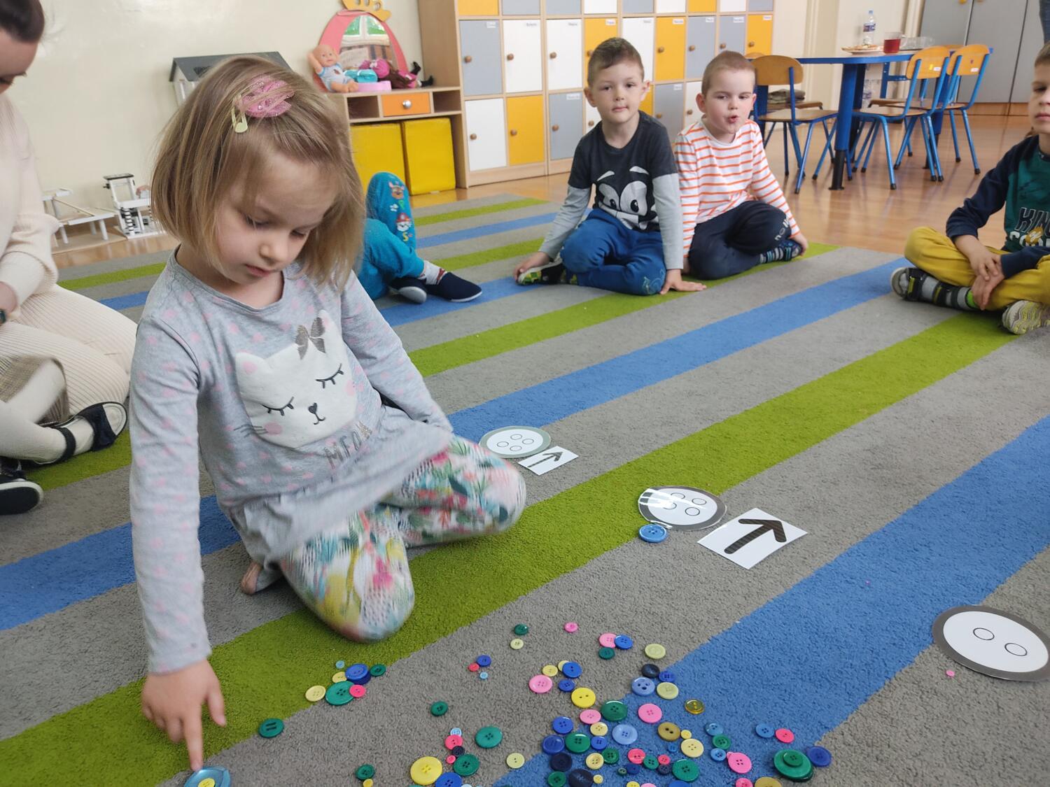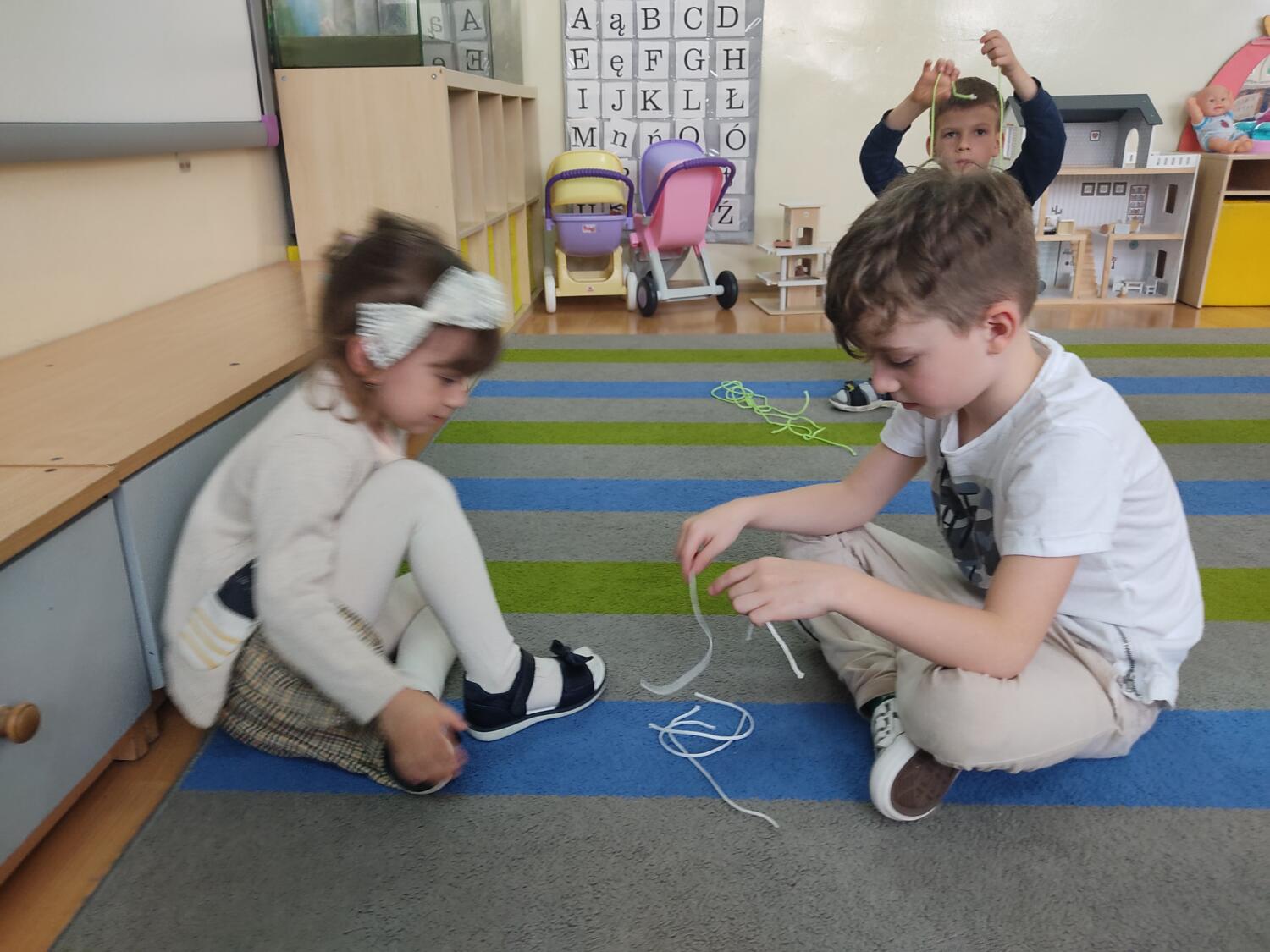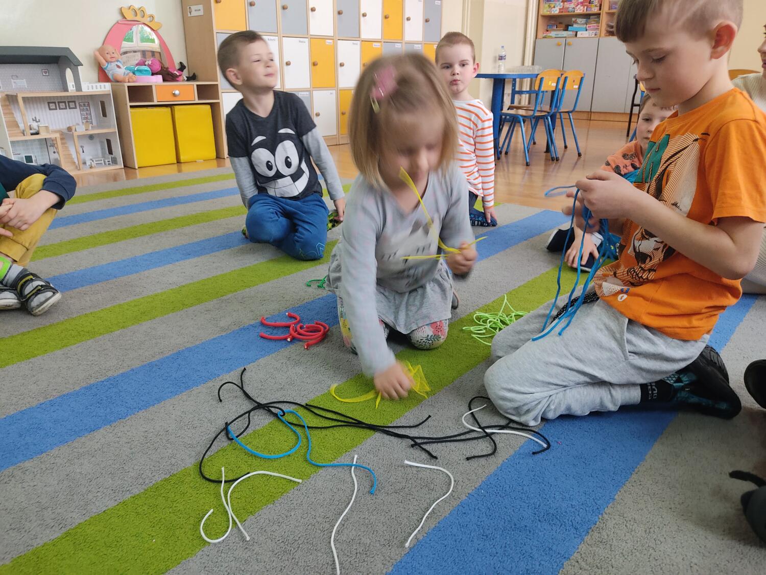 „Guziki i sznurki z pętelką „-to kolejny warsztat kodowania ,tym razem z sznurkami, guzikami.Dzieci samodzielnie eksplorowały z guzikami, pozwalałam na popełnianie błędów, poszukiwaliśmy rozwiązań- klasyfikowaliśmy sznurki, guziki wg.jednej, dwóch, trzech cech jakościowych, wyszukiwaliśmy obiekty posiadająca daną cechę- mierzyliśmy „na oko”kolorowe sznurki, tworzyliśmy z sznurka figury geometryczne.S.L