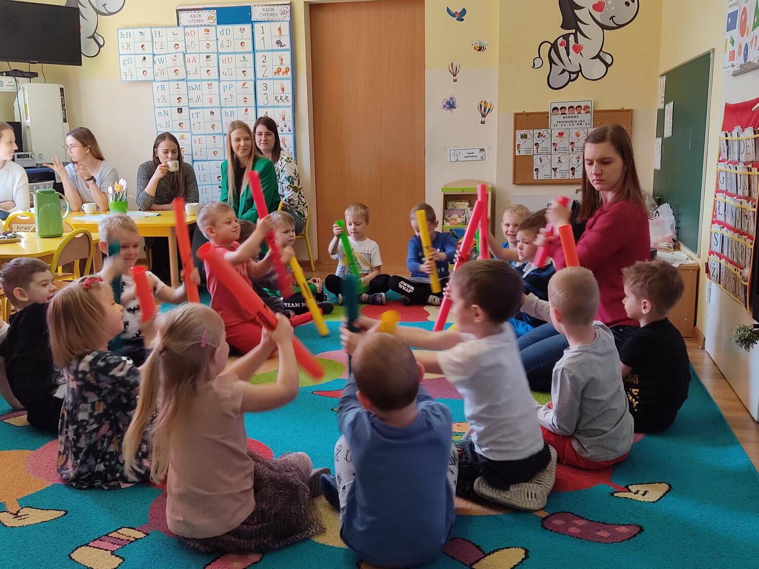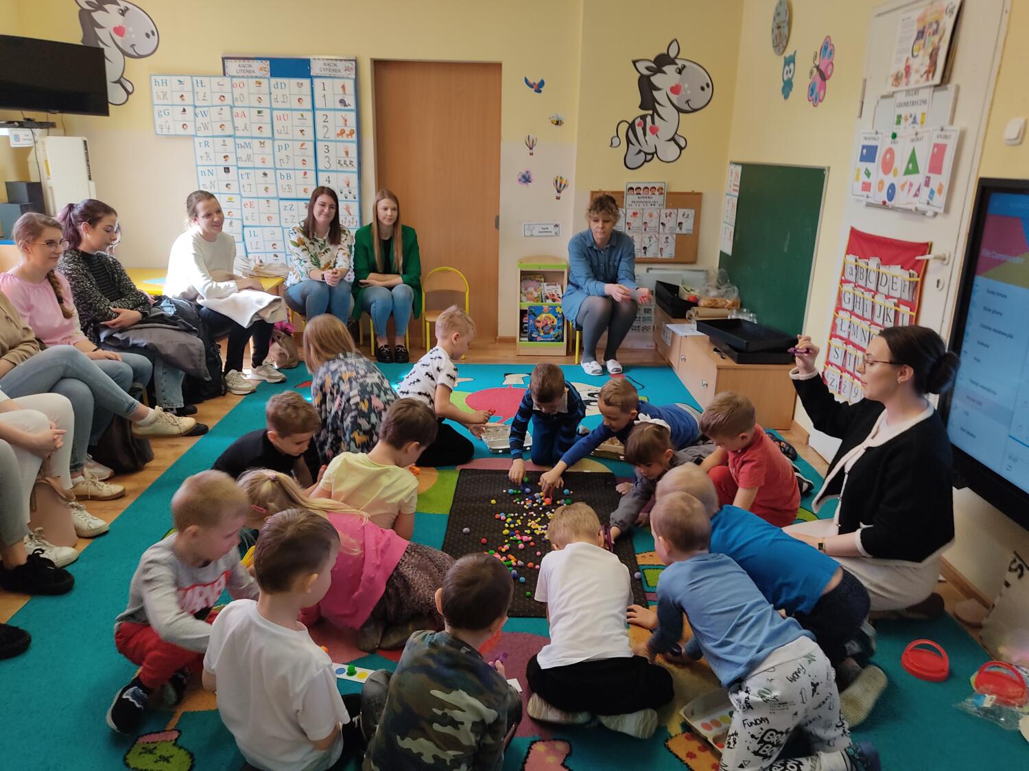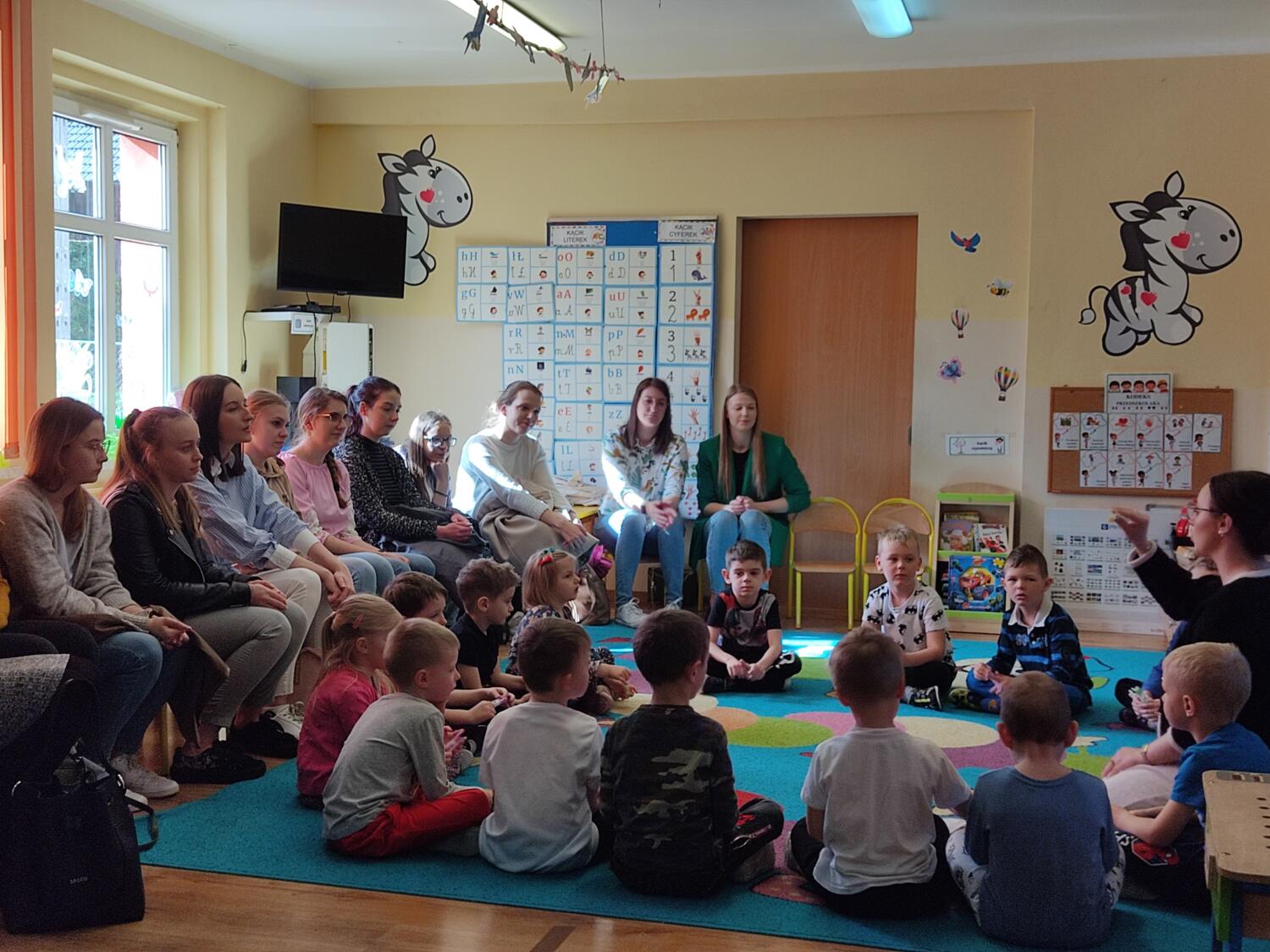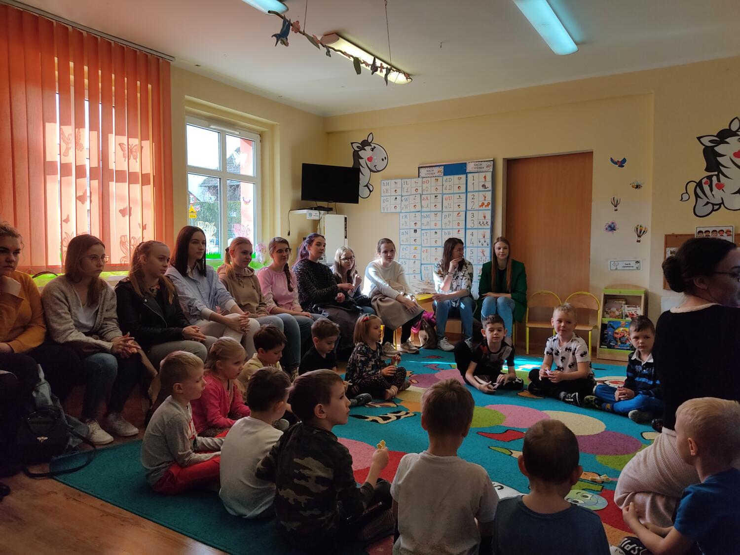 Dzisiaj sale tropicieli i bystrzaków wypełnili goście z Akademii Nauk Stosowanych w Raciborzu, z opiekunem Panią dr Kornelią Solich .Uczestniczki – studentki miały okazję zobaczyć w praktyce nasze działania innowacyjne realizujące w grupach. Tak więc ,najpierw duża dawka terapii ręki , potem zajęcia TUS z elementami bibliterapii , by zakończyć Batti Strauss-aktywne słuchanie muzyki. Na samym końcu studentki wysłuchały wykładu „Półka pełna myśli”, która to prezentacja miała dać zgromadzonym Paniom wiedzę, do jakiej literatury należy sięgać ,by stać się empatycznym i dobrym przede wszystkim człowiekiem. Dziękuję moim młodszym koleżankom , które poprowadziły terapię ręki- Pani Patrycji, a aktywne słuchanie B. Strauss  zrealizowała dzisiaj Pani Sonia.Dziękuję naszym dzieciom, które były bardzo odważne, dały się poznać jako bardzo aktywne, chętne do działania, próbowania i dzielenia się swoimi wrażeniami. BRAWO!!