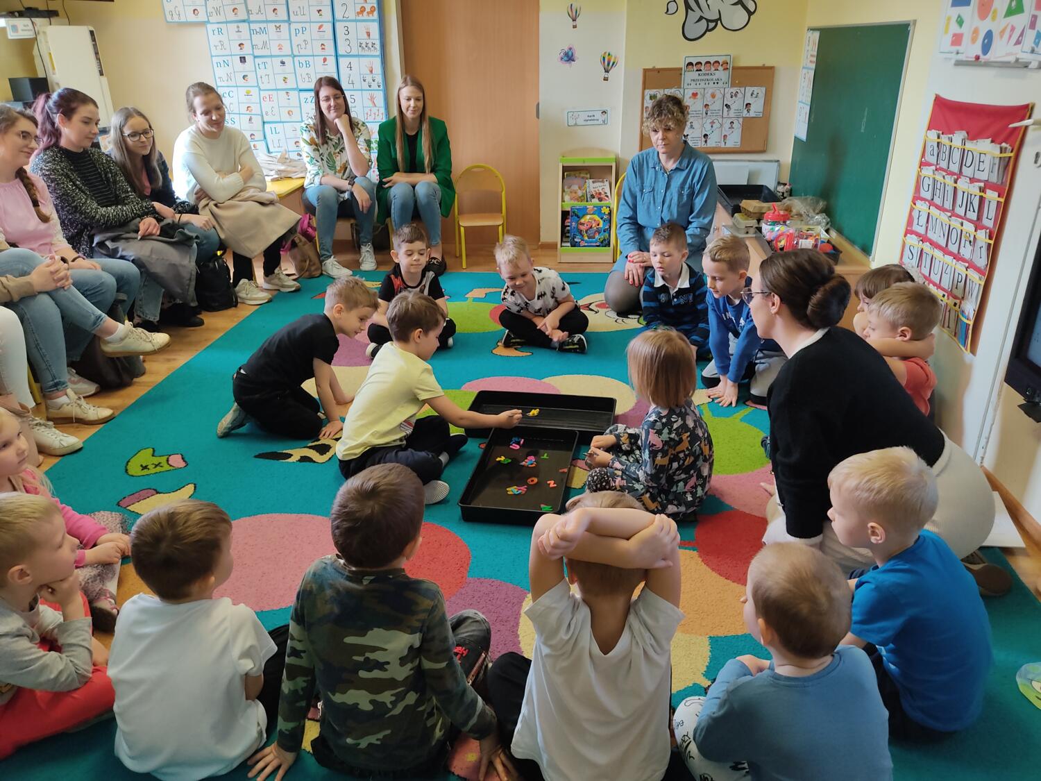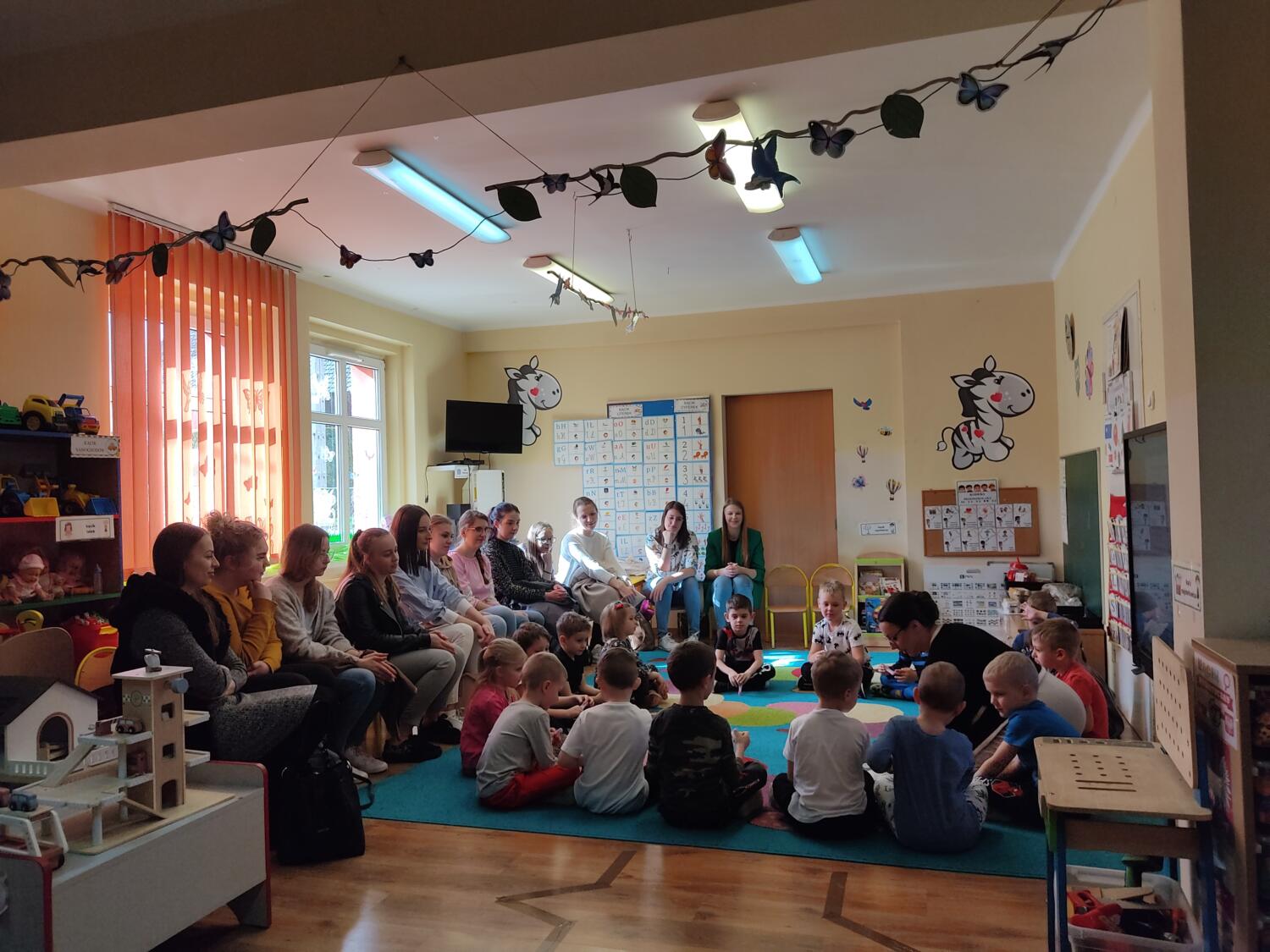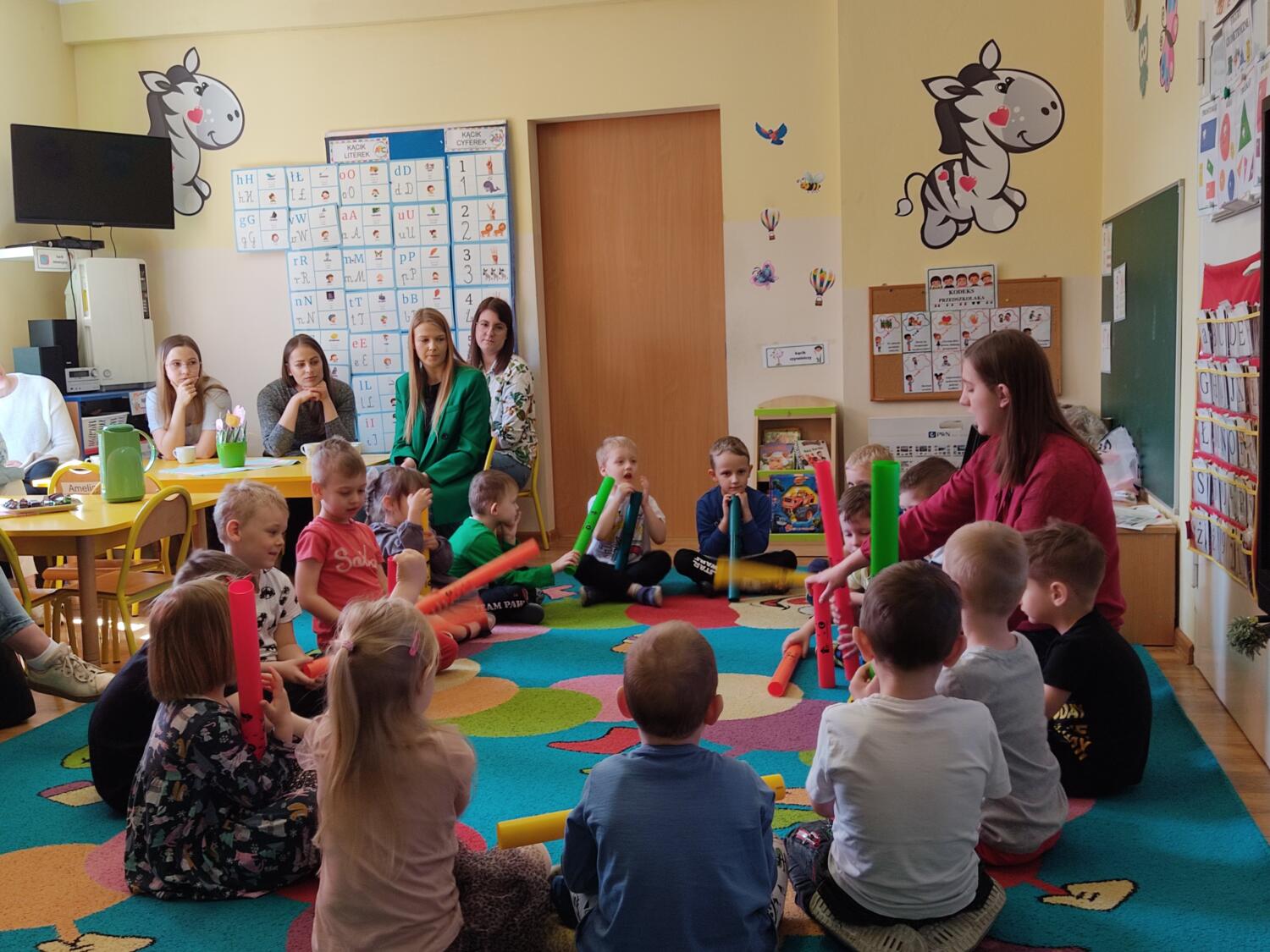 Dzisiaj sale tropicieli i bystrzaków wypełnili goście z Akademii Nauk Stosowanych w Raciborzu, z opiekunem Panią dr Kornelią Solich .Uczestniczki – studentki miały okazję zobaczyć w praktyce nasze działania innowacyjne realizujące w grupach. Tak więc ,najpierw duża dawka terapii ręki , potem zajęcia TUS z elementami bibliterapii , by zakończyć Batti Strauss-aktywne słuchanie muzyki. Na samym końcu studentki wysłuchały wykładu „Półka pełna myśli”, która to prezentacja miała dać zgromadzonym Paniom wiedzę, do jakiej literatury należy sięgać ,by stać się empatycznym i dobrym przede wszystkim człowiekiem. Dziękuję moim młodszym koleżankom , które poprowadziły terapię ręki- Pani Patrycji, a aktywne słuchanie B. Strauss  zrealizowała dzisiaj Pani Sonia.Dziękuję naszym dzieciom, które były bardzo odważne, dały się poznać jako bardzo aktywne, chętne do działania, próbowania i dzielenia się swoimi wrażeniami. BRAWO!!